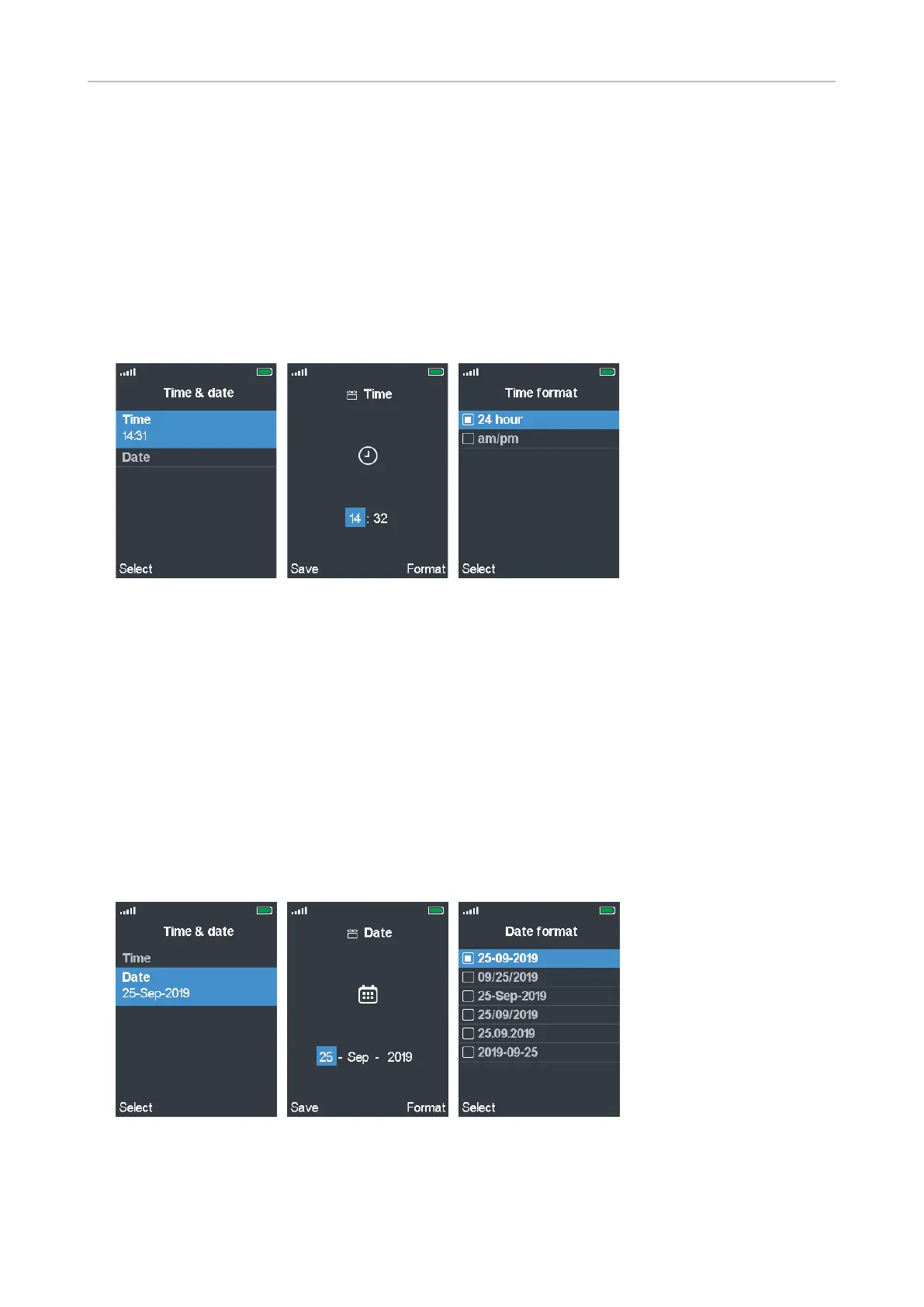 Available time formats are 24 hours and 12 hours AM/PM. There are six available date formats