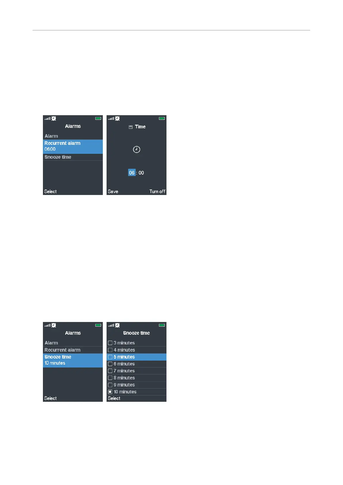 2. In the Alarms menu, scroll to Recurrent alarm and press the function key underneath Select