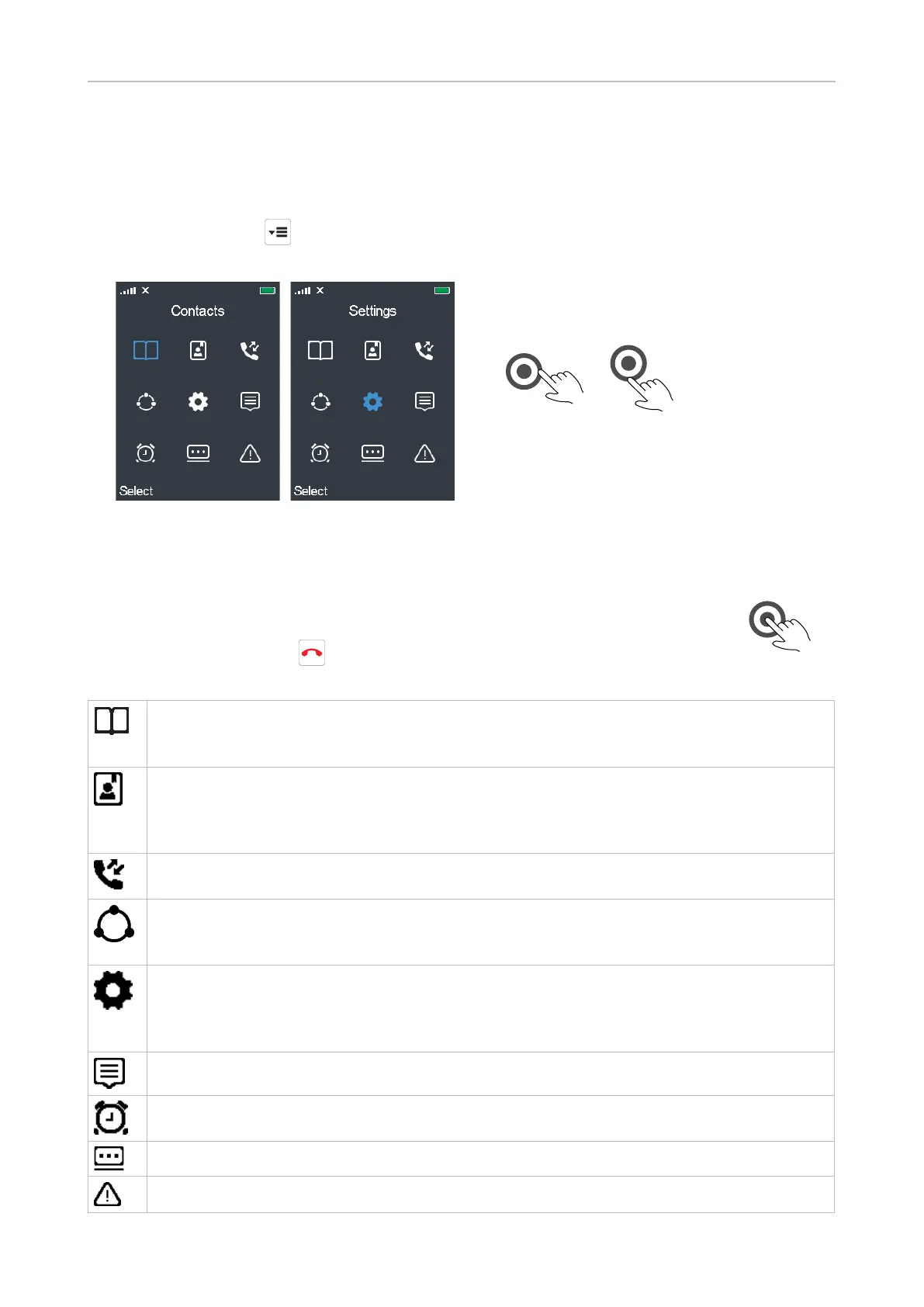 1. Press the menu key to open the top menu. The screen will open with the Contacts symbol