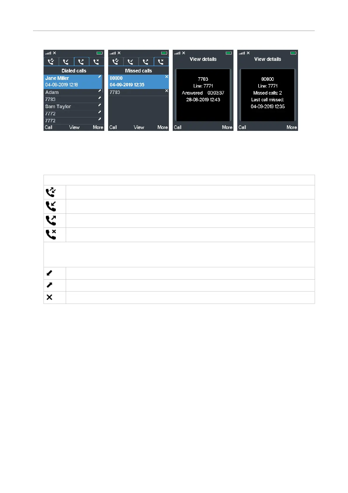if available, or the number of the caller and a symbol on the right side of each line indicating