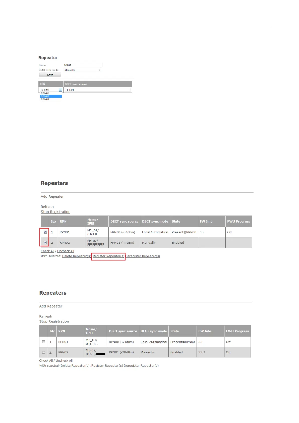 Upon successful registration, the Repeater page will show the RPNs of the newly added repeater