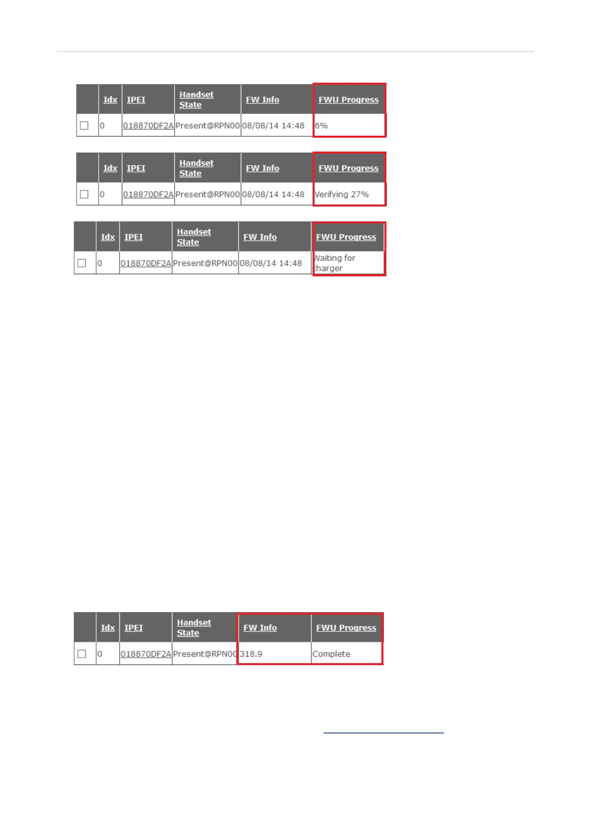If the update was successful, the handset will turn on again, and the web interface will indicate