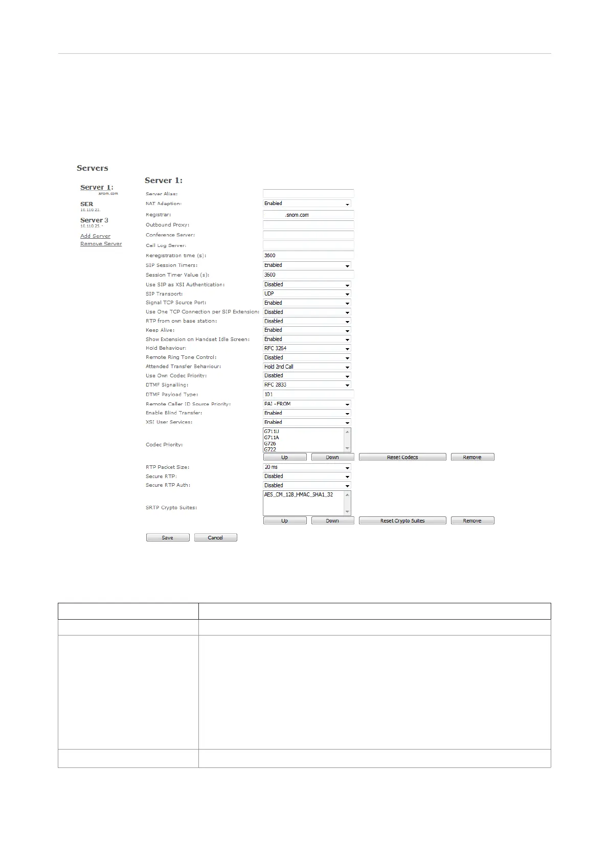 On this page you add and remove SIP/NAT servers, select the server the base station should connect