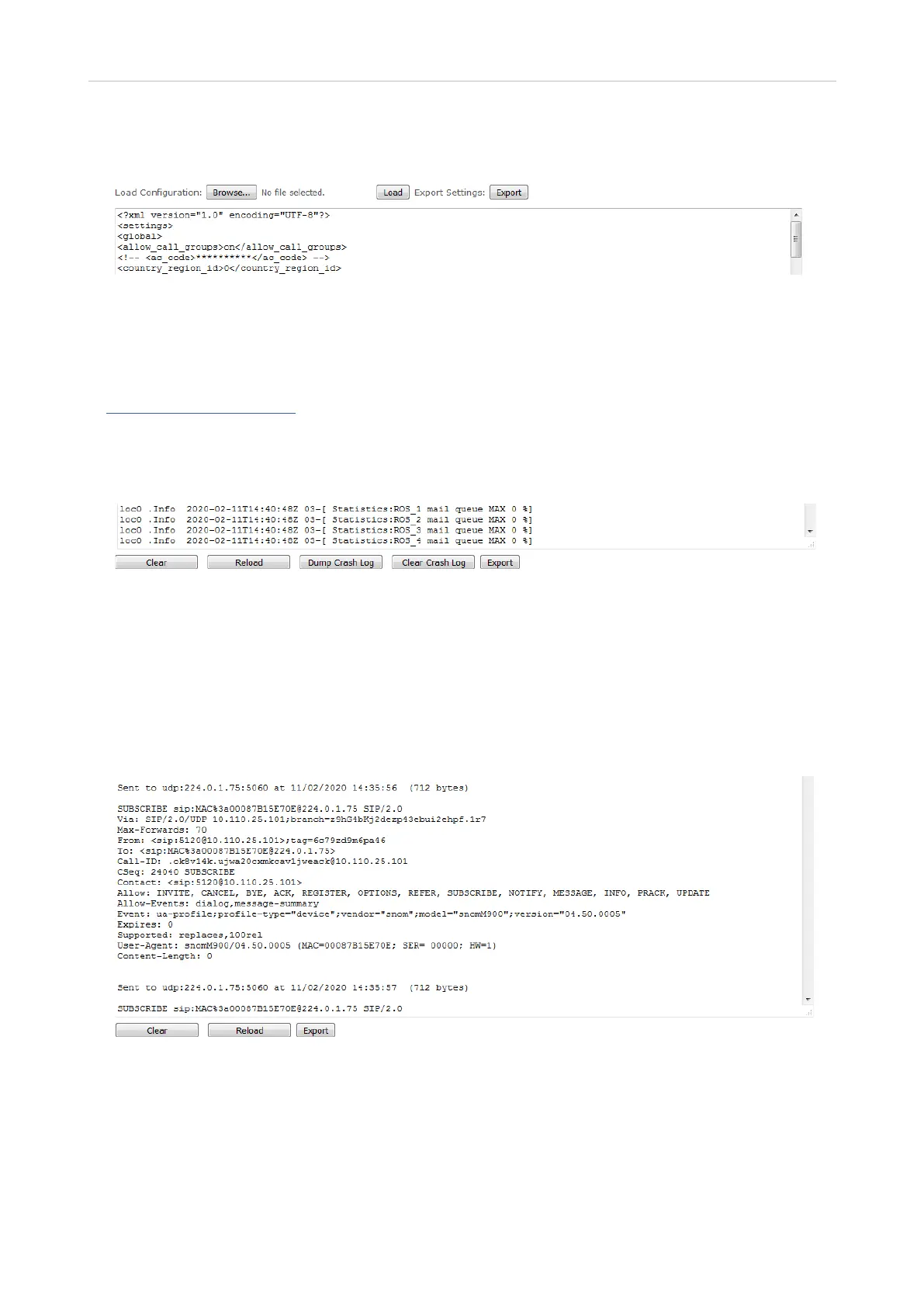 shown here depend on the syslog settings configured on the Management page. To dump the log, use