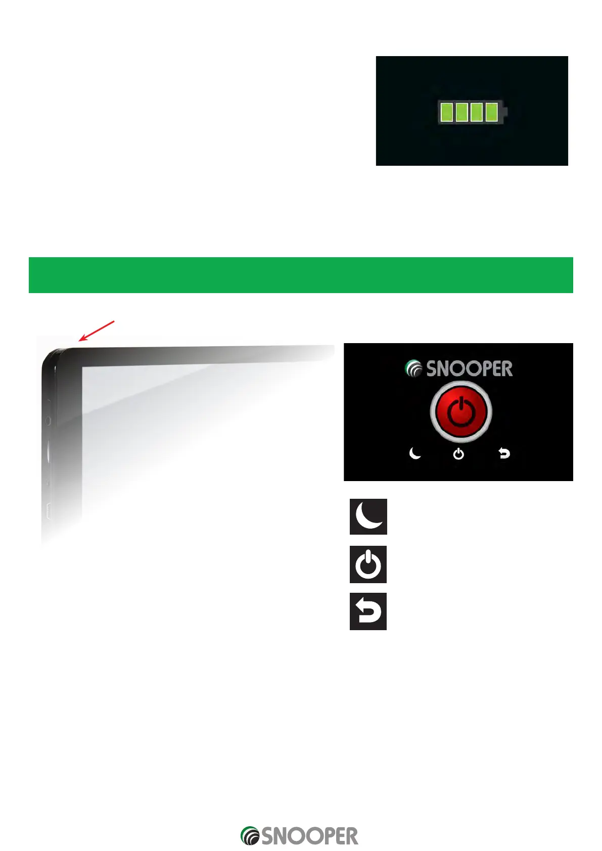 Note: the battery is designed to be a back up ONLY and Snooper recommends that the the navigation device is powered from