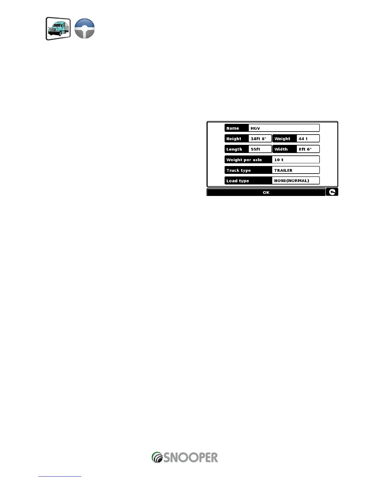 height, weight and width. It is possible to save the settings of 10 different trucks. Follow these instructions to enter your vehicles