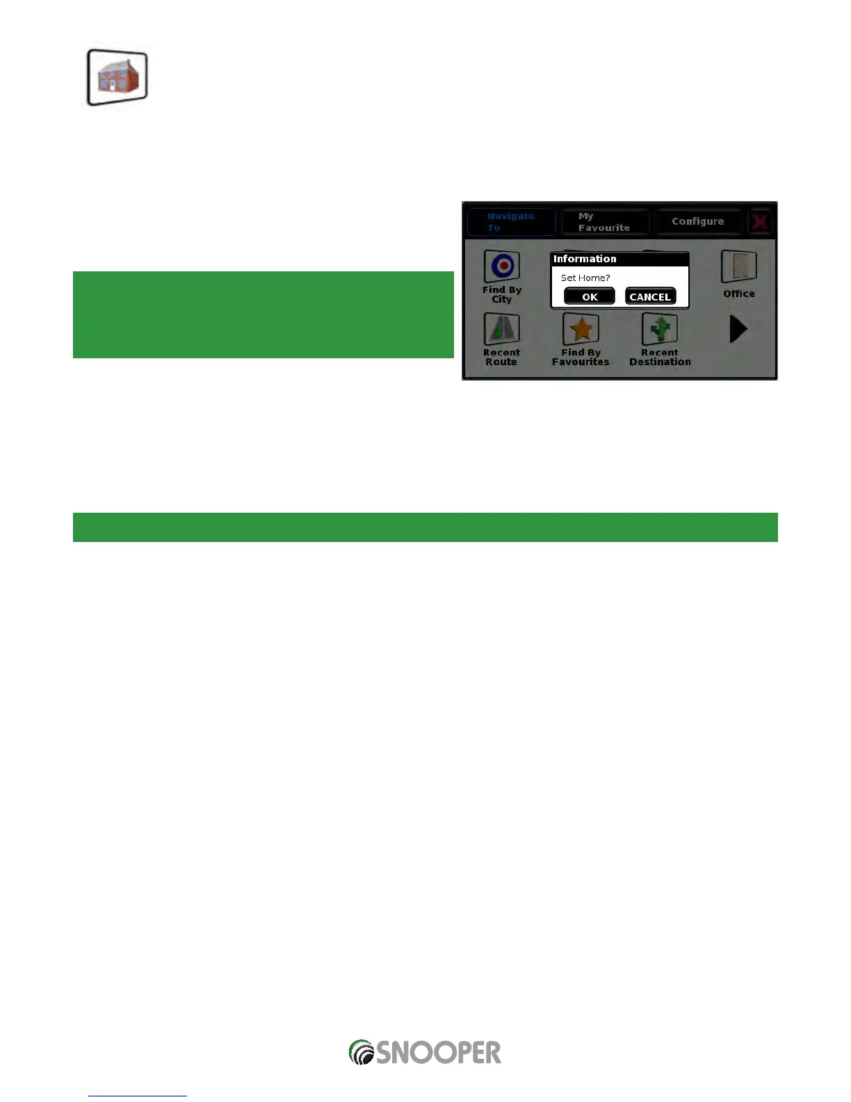 You can navigate easily and quickly from a previous journey or destination to your home, by personalising Snooper so that a route