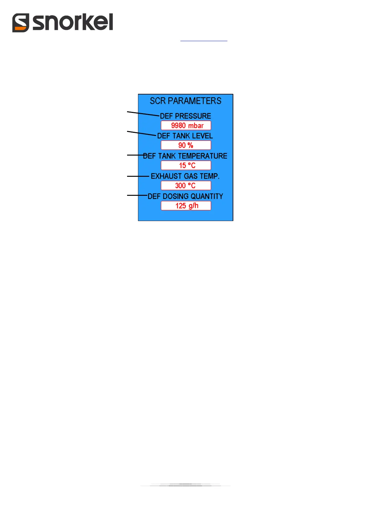 The SCR PARAMETERS page provides information on the status of the exhaust gas post-treatment system: