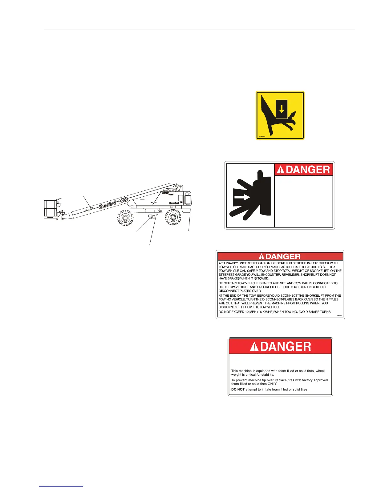 To prevent machine tip over, replace tires with factory approved