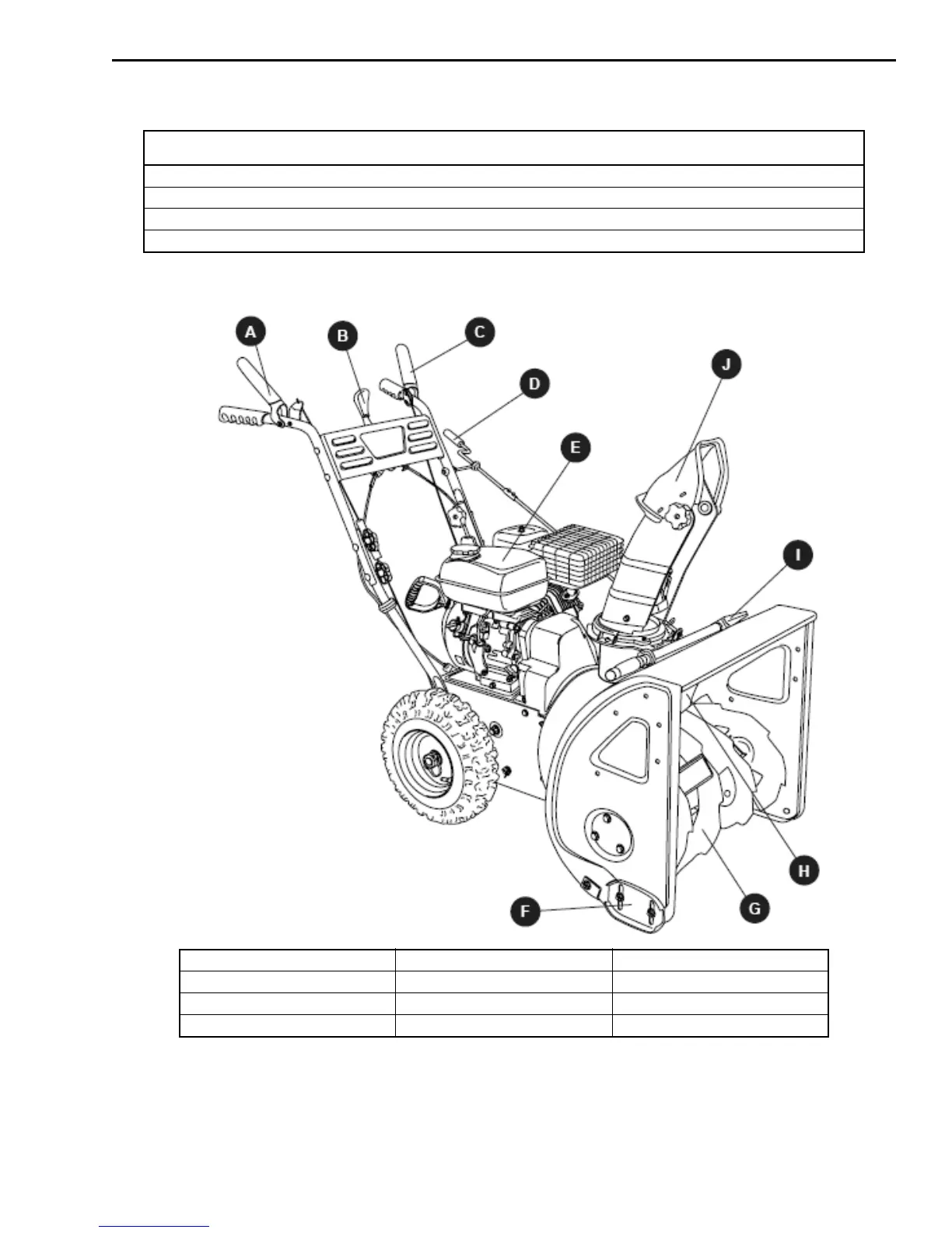 A - Drive Control Handle E - Engine I - Snow/Ice Clean Out Tool