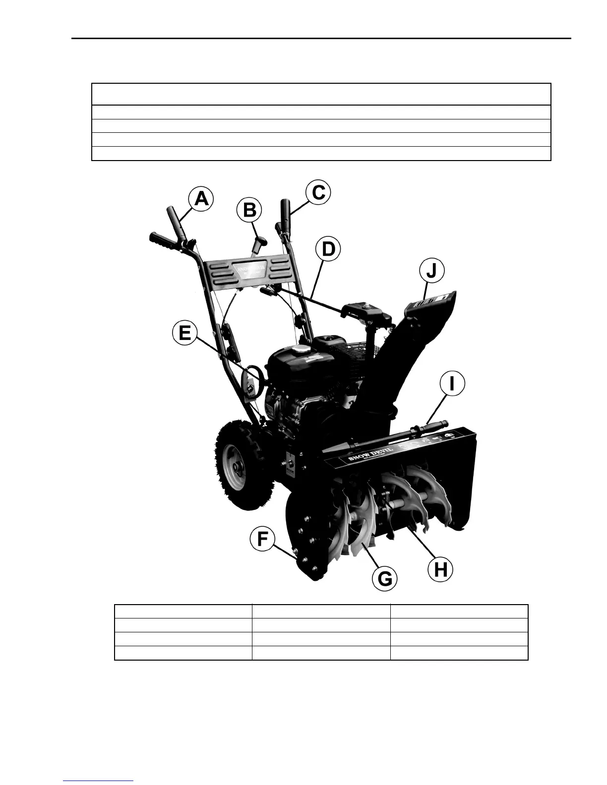 A - Drive Control Handle E - Engine I - Snow/Ice Clean Out Tool