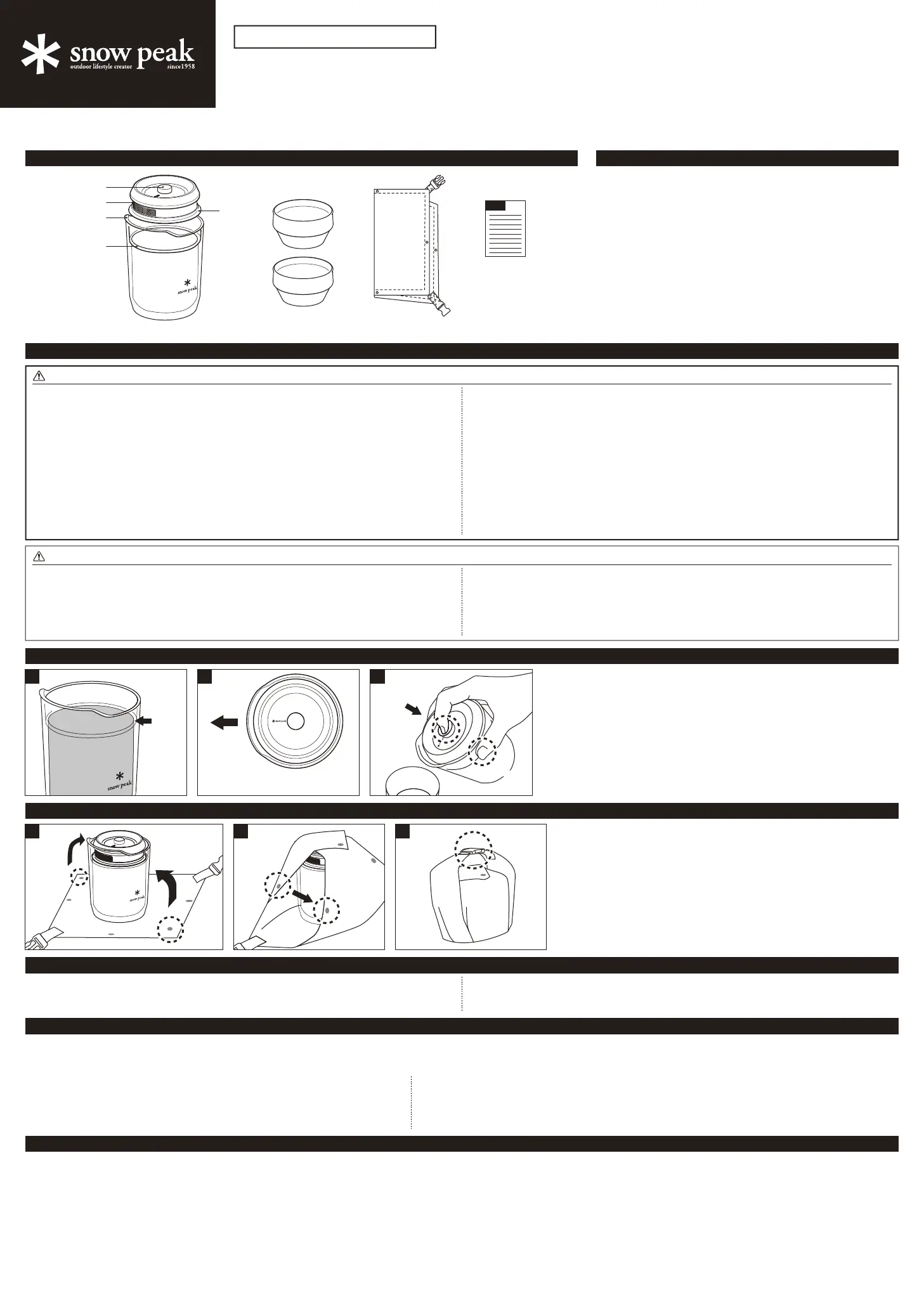 Thank you for purchasing a Snow Peak product. This product is a teapot set. For safety, read the following instruction manual before use. Please keep it safe for future reference. Finally, if you find anything