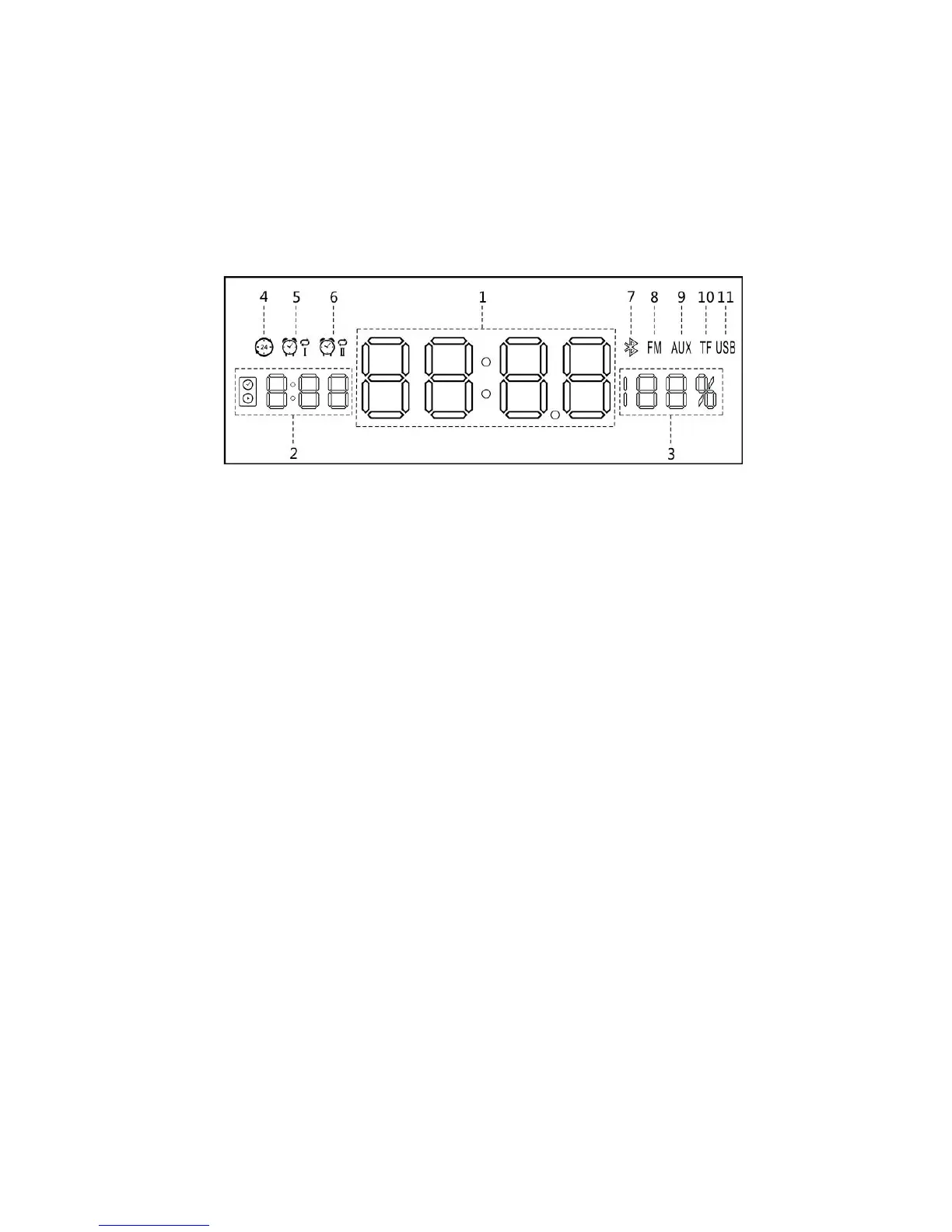 1,Clock,Mode state, Radio frequency and radio number,Playing time