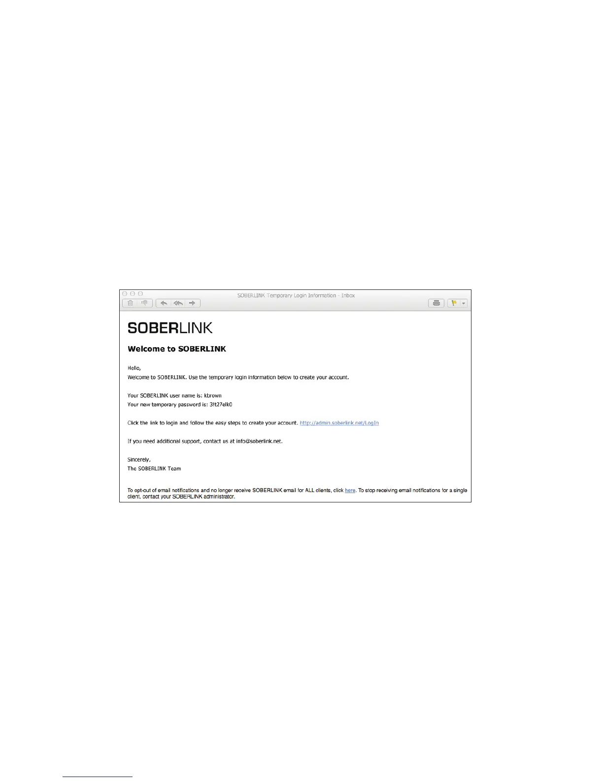 A “Welcome to Soberlink” message and temporary login will be sent to the User’s conrmed email address.
