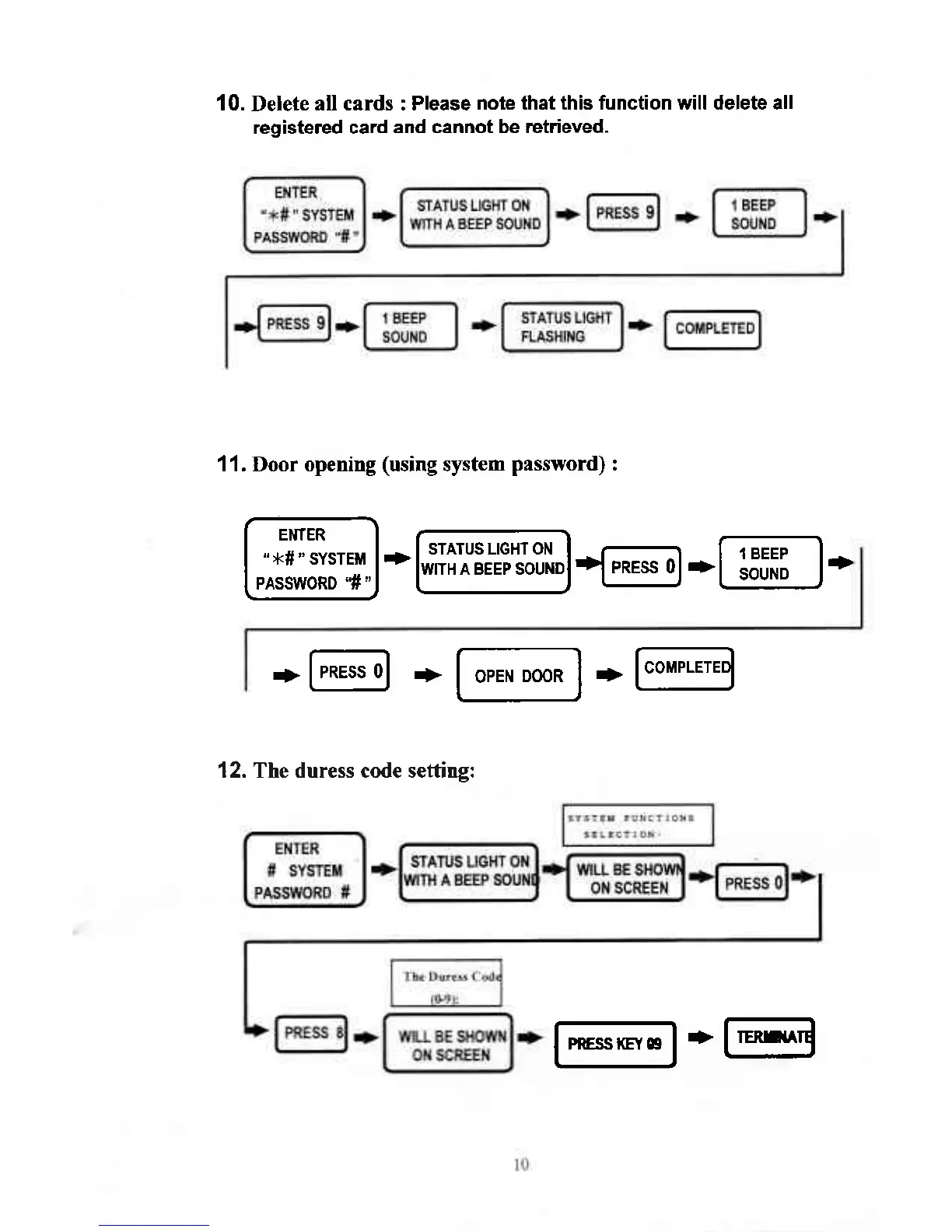 Soca ST-320 - DELETION OF BATCH REGISTRATION (DELETE ALL CARDS); DOOR OPENING (USING SYSTEM PASSWORD); THE DURESS CODE SETTING