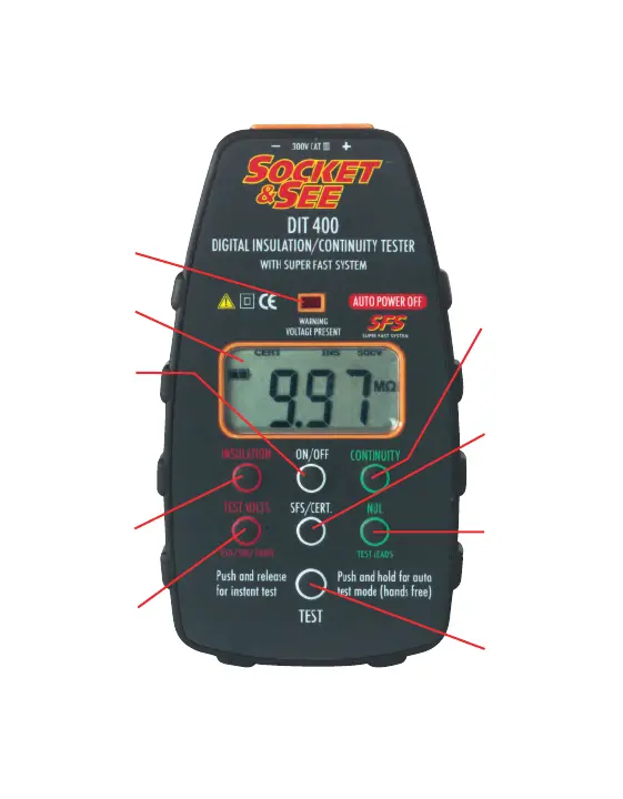 Socket & See DIT 400 - Detailed Operation and Controls; Tester Indicators and Power Controls; Insulation Testing Modes and Voltages; Continuity Testing and Lead Null
