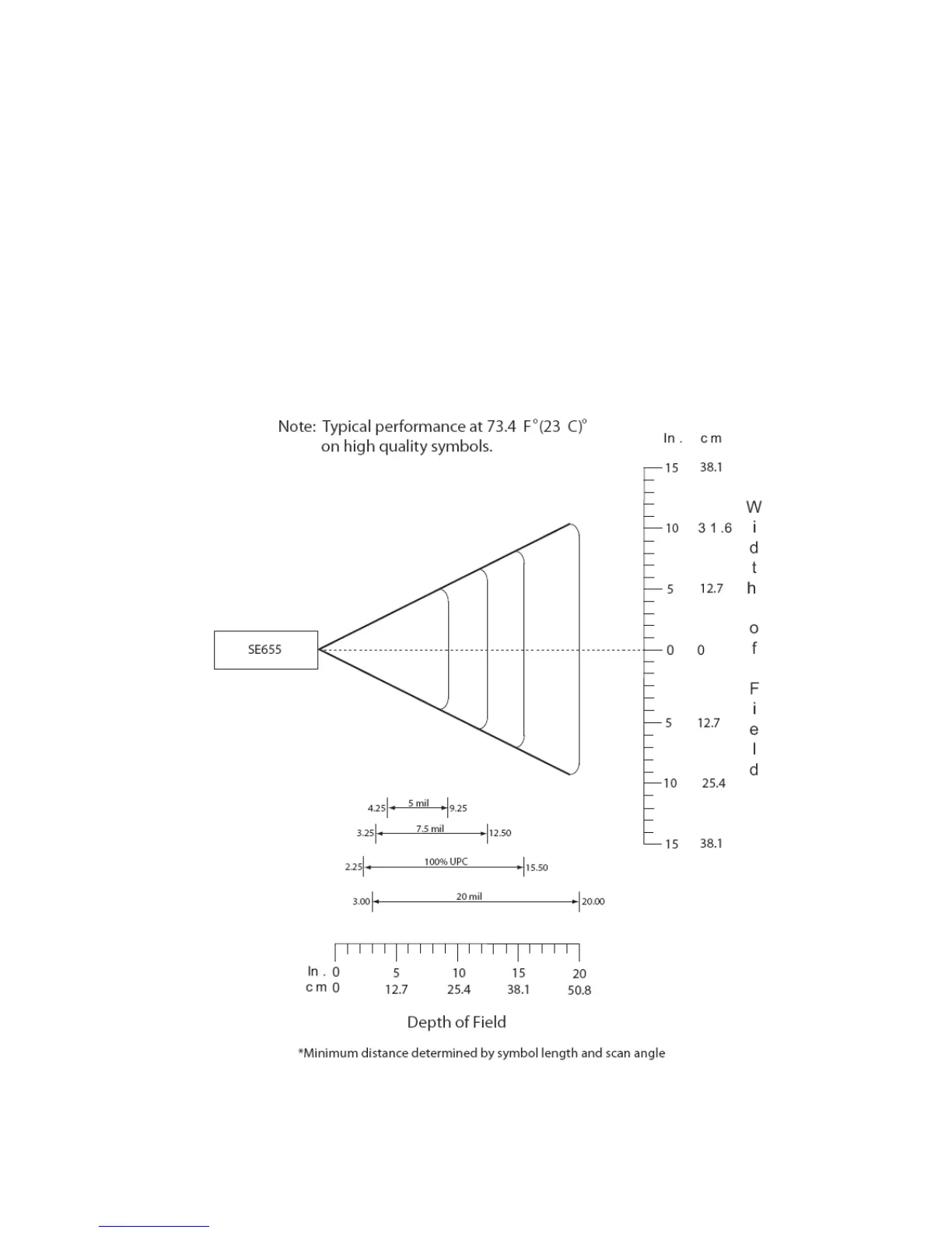 typical scanning distances (depths of field) for selected barcode sizes. The maximum usable length