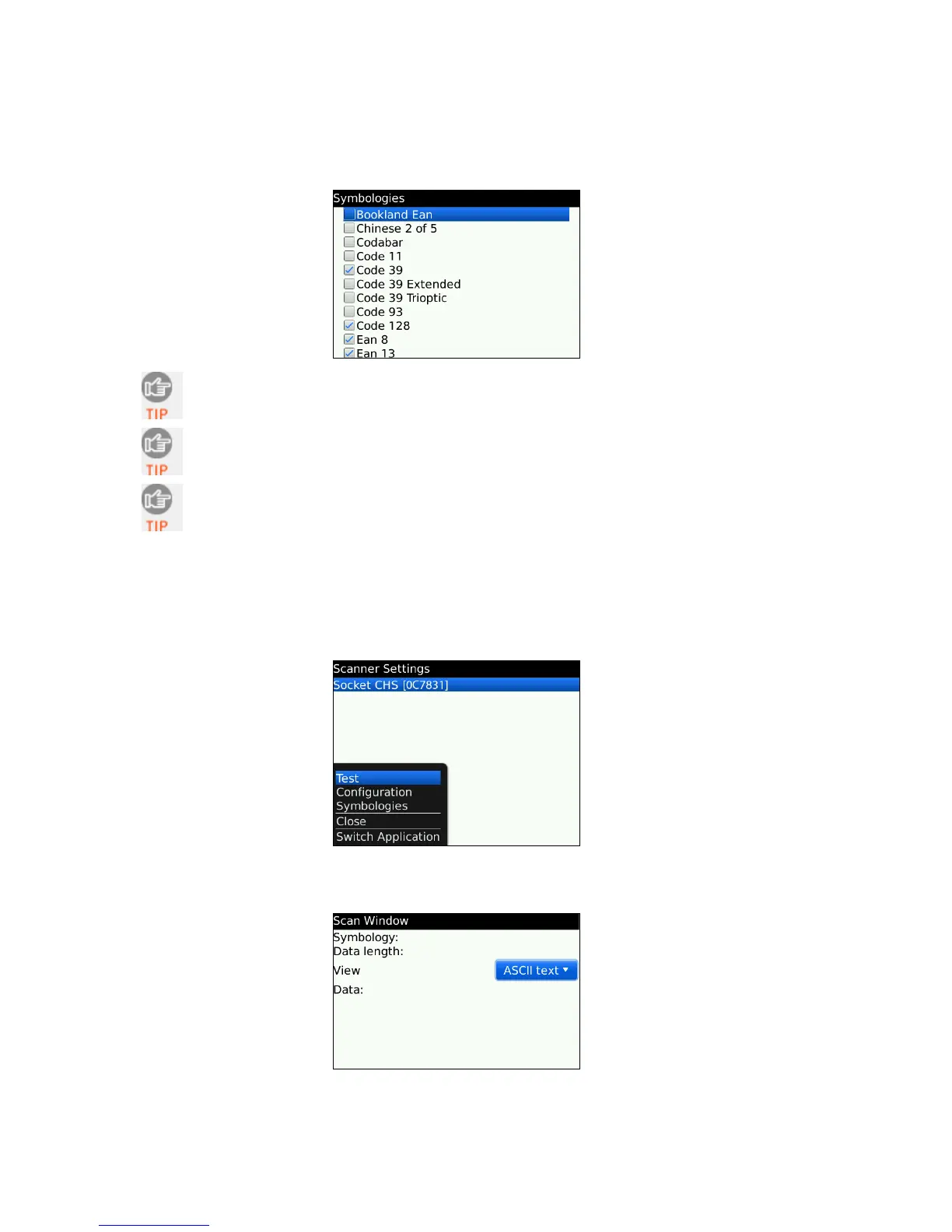 1. In Scanner Settings, click Menu | Symbologies. Press the space bar to enable or disable