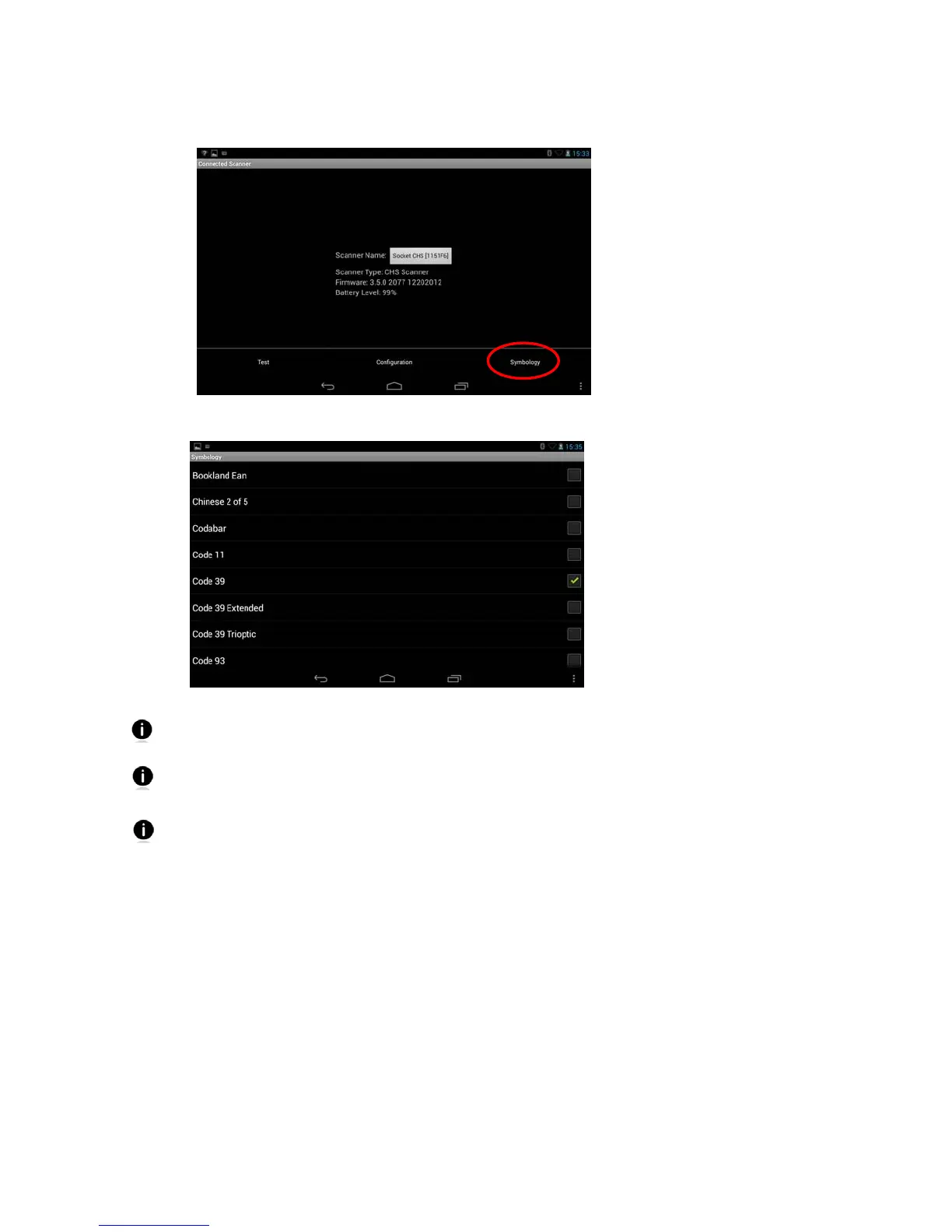 1. In the main screen of Scanner Settings, touch Menu | Symbology.