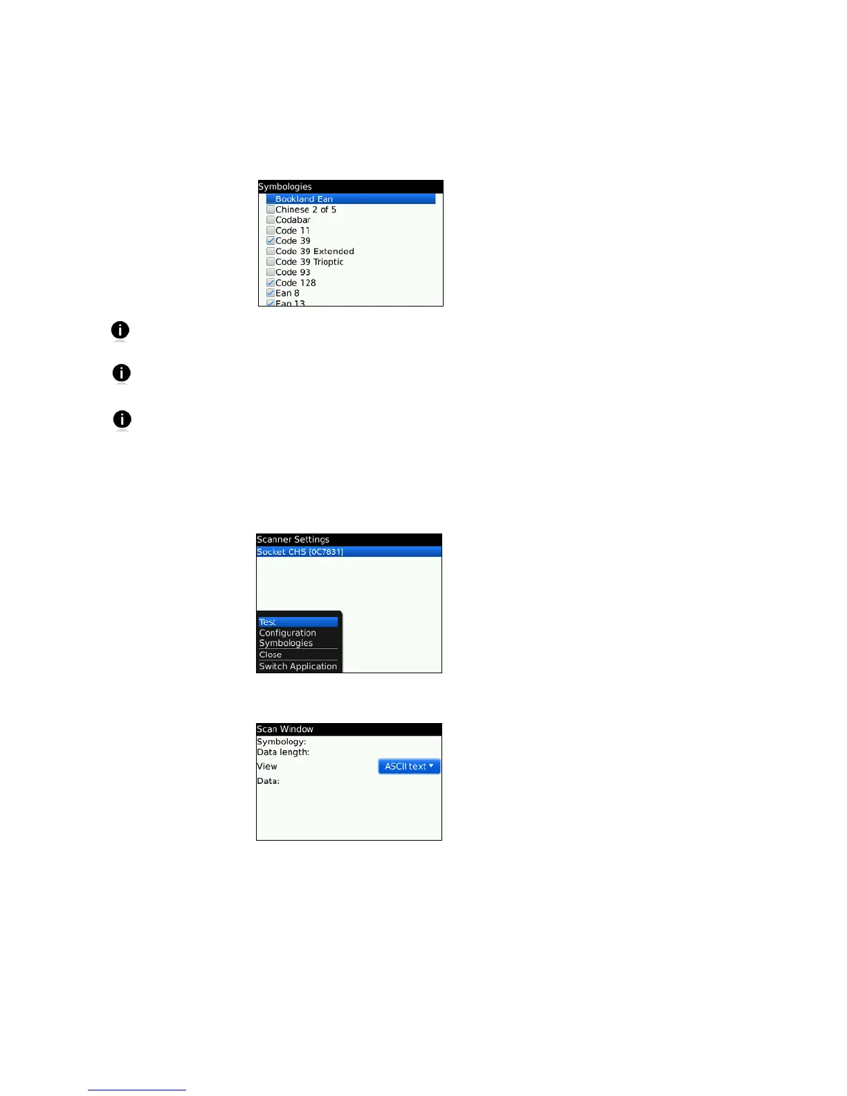 1. In Scanner Settings, click Menu | Symbologies. Press the space bar to enable or disable