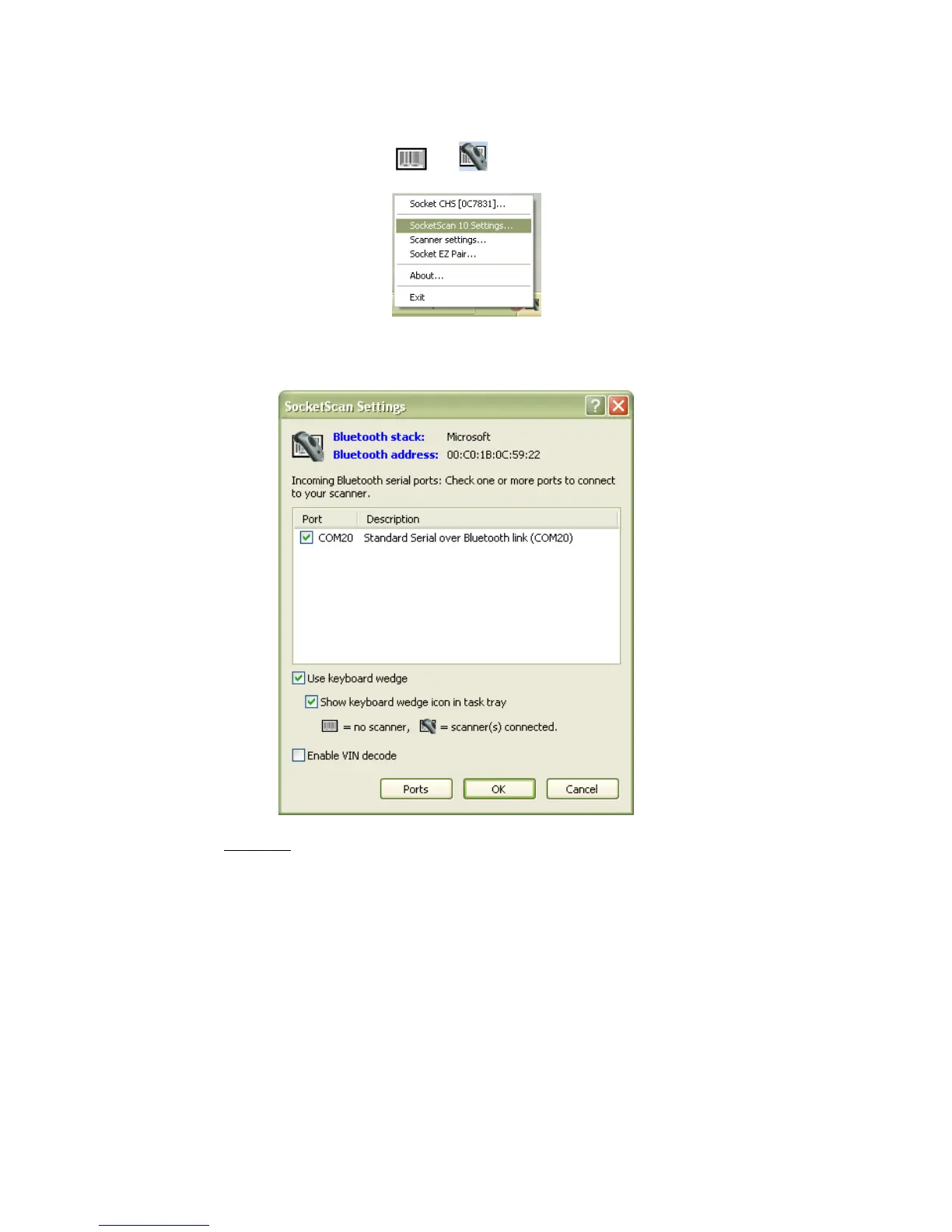 o If a suitable port is not listed in SocketScan 10 Settings, click Ports to use your