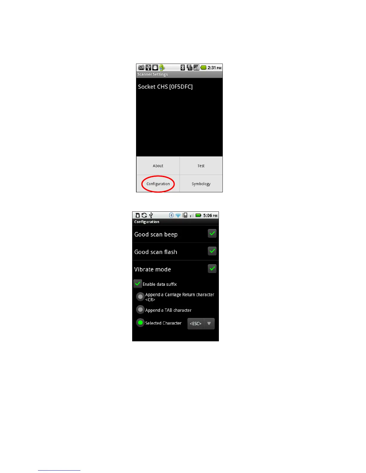 1. In the main screen of Scanner Settings, touch Menu | Configuration.