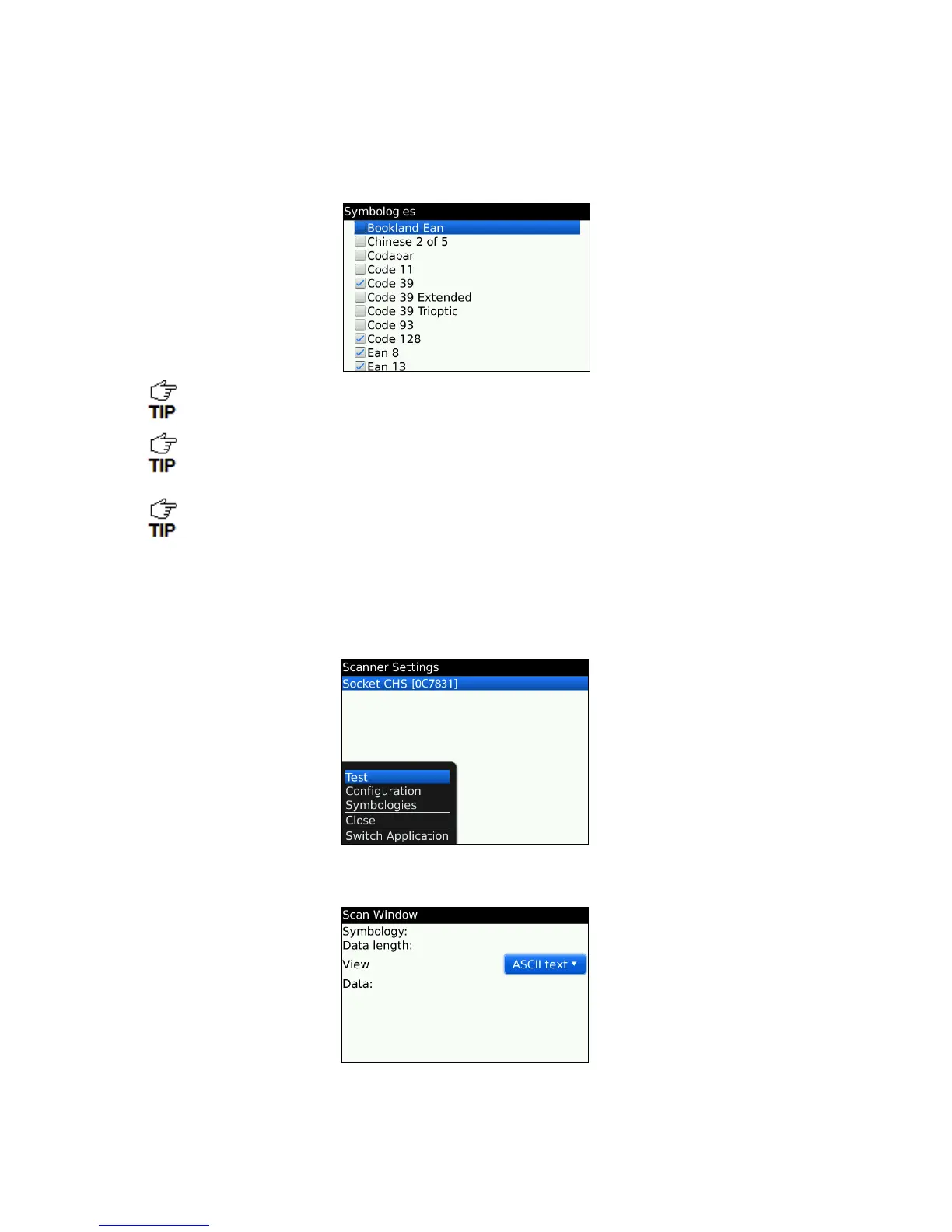 1. In Scanner Settings, click Menu | Symbologies. Press the space bar to enable or disable