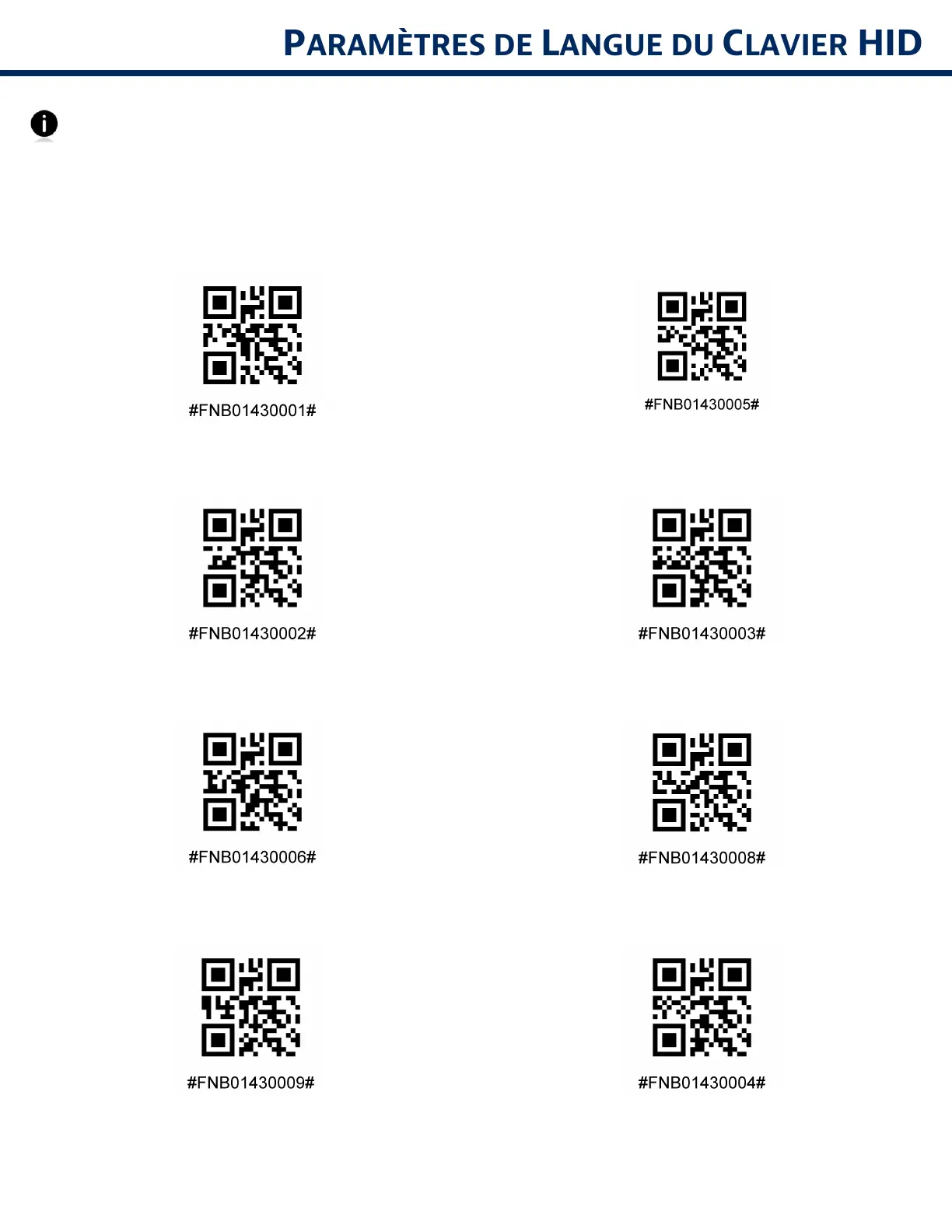 Ces codes-barres permettent de configurer le lecteur pour différentes langues en utilisant la