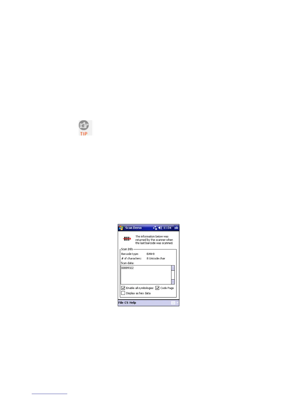 1. Tap Start | Programs | SocketScan folder | Scan Demo.