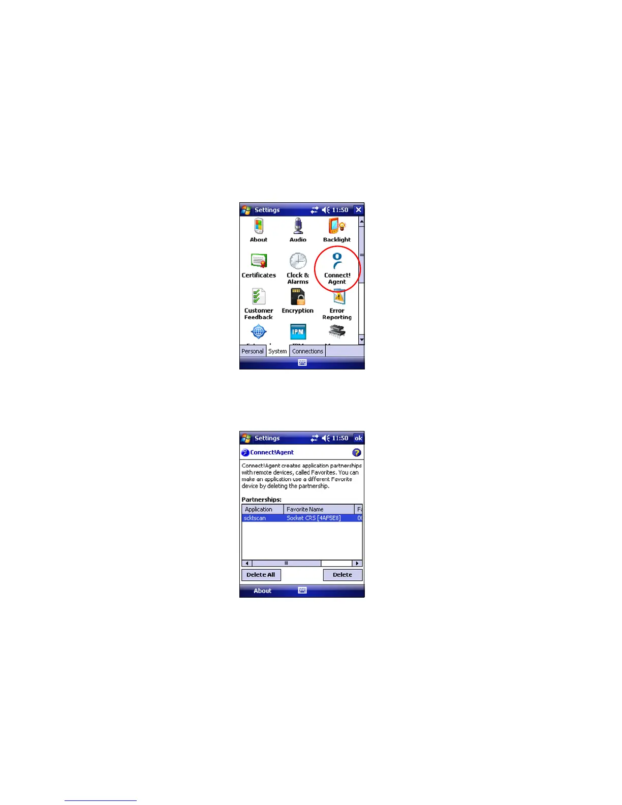 1. Tap Start | Settings | System tab | Connect!Agent.