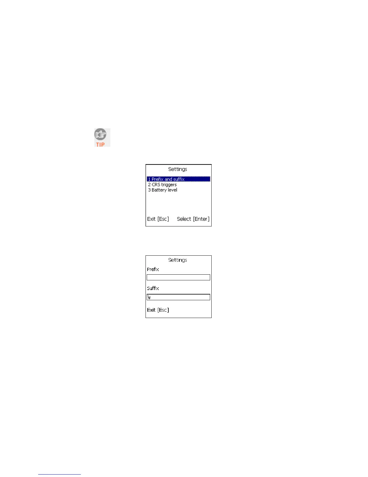 2. In the Settings menu, press 1 Prefix and suffix.
