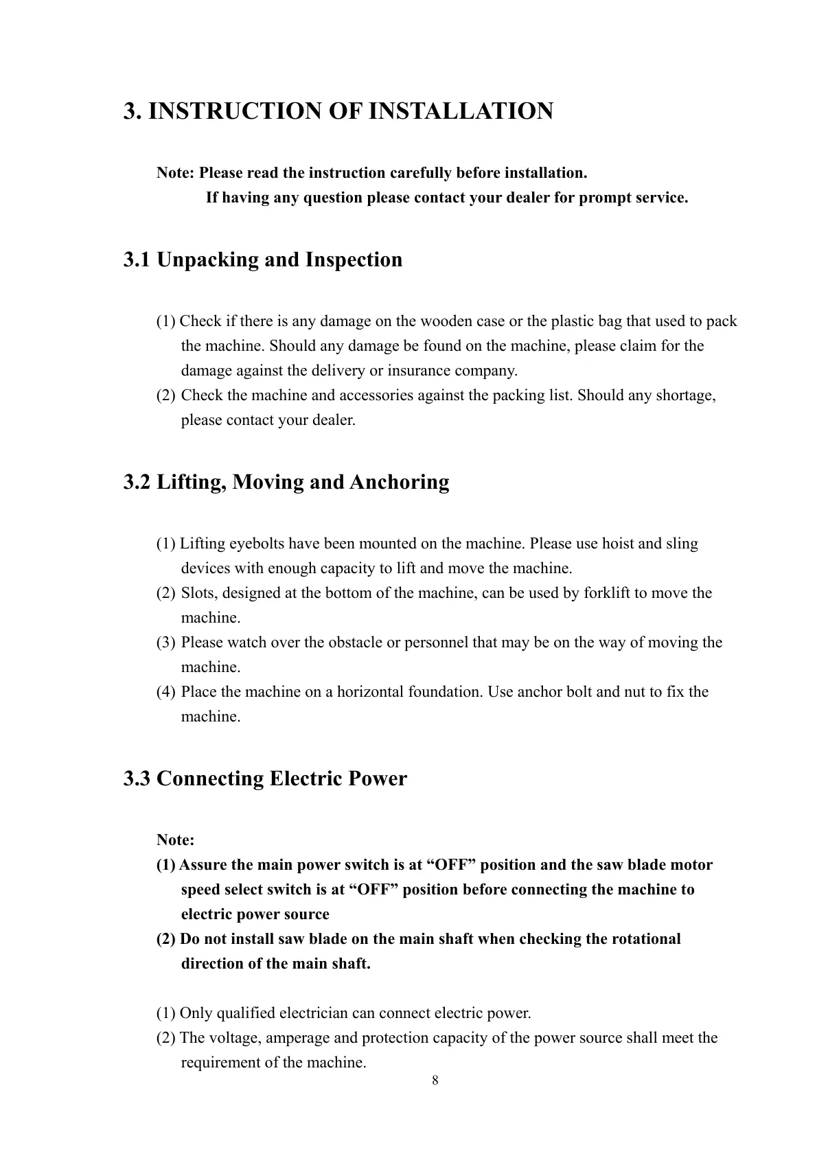 (2) Check the machine and accessories against the packing list. Should any shortage,