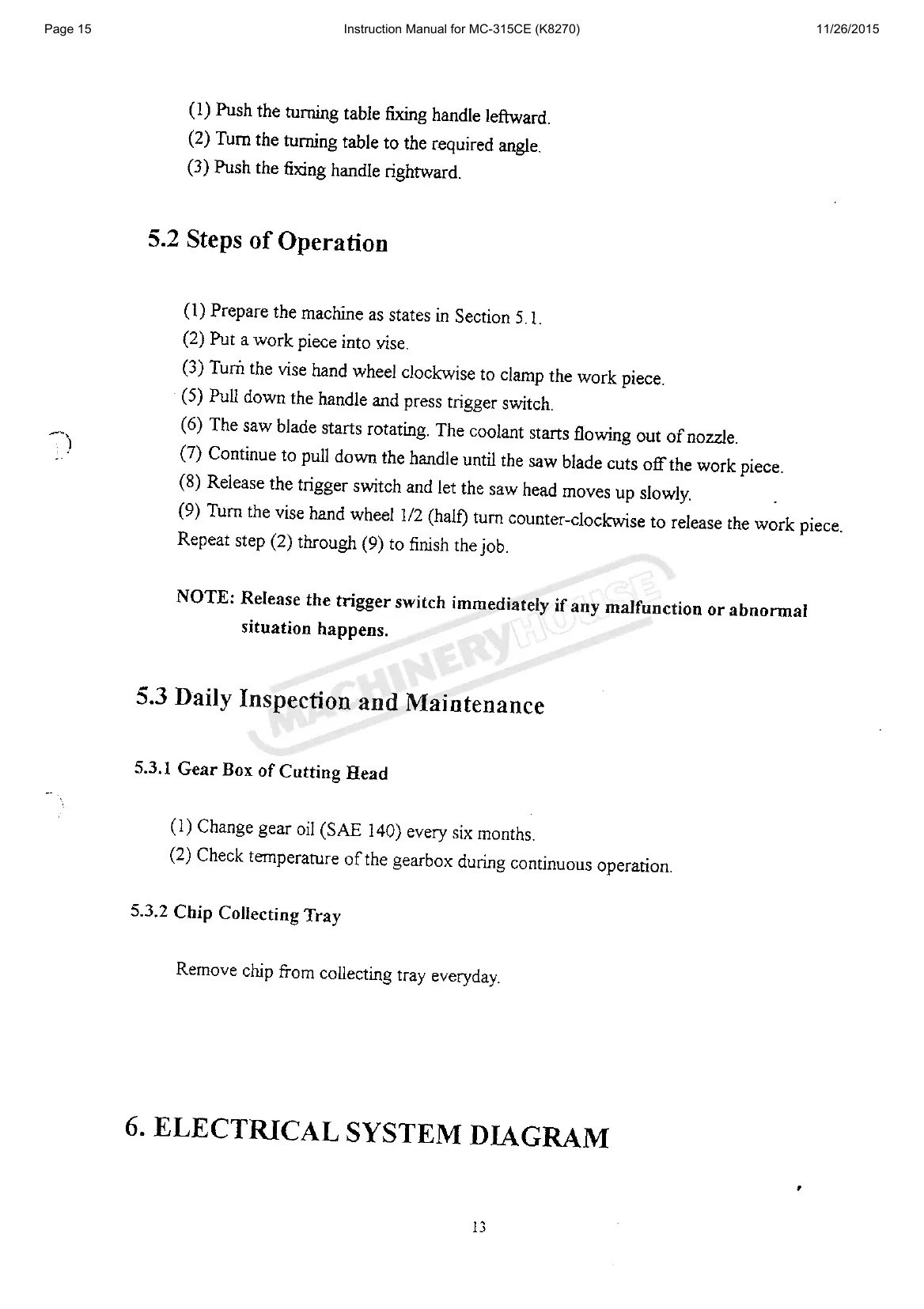 SOCO MC-315F - Steps of Operation; Daily Inspection and Maintenance; Gear Box of Cutting Head; Chip Collecting Tray