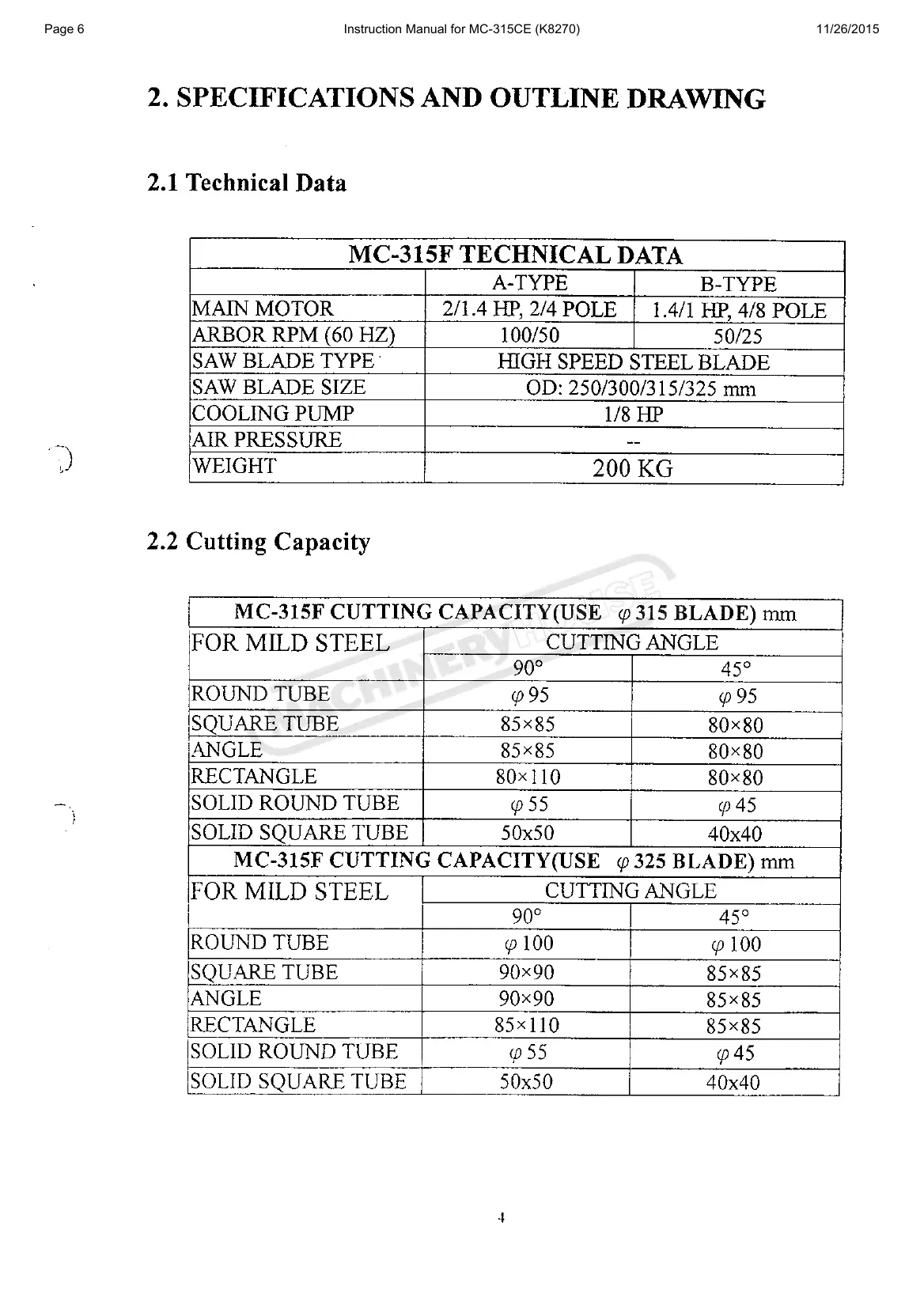 SOCO MC-315F - 2. SPECIFICATIONS AND OUTLINE DRAWING; 2.1 Technical Data; 2.2 Cutting Capacity