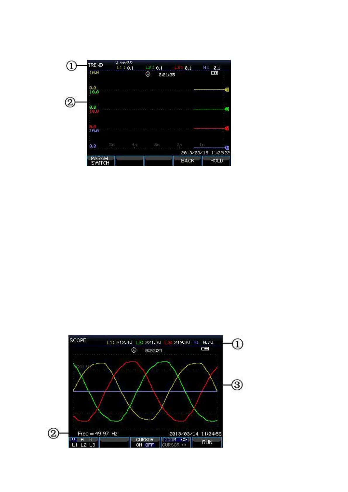 (1) Zeigt aktuellen Wert der Trend-Anzeige. Wenn der Cursor eingeschaltet ist,