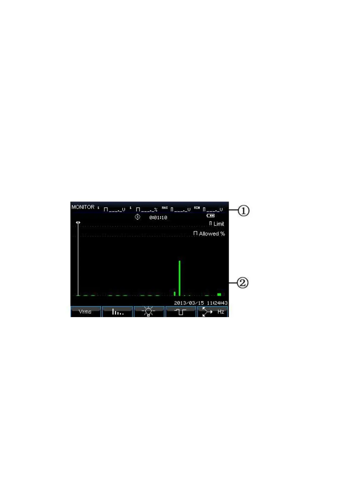 Die Netzqualität Bargraph-Anzeige enthält zum Beispiel: Spannung RMS,