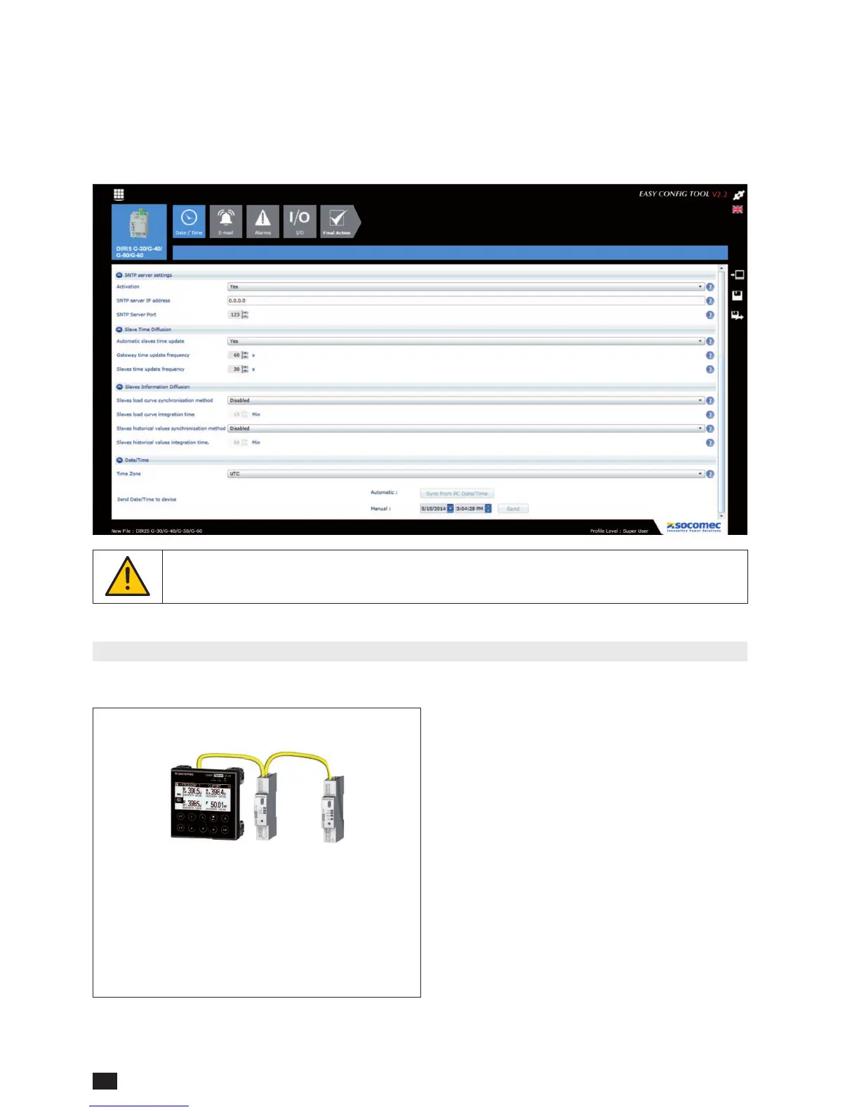 The screen below shows how to set the time from the DIRIS G gateway. The time setting is done from an SNTP