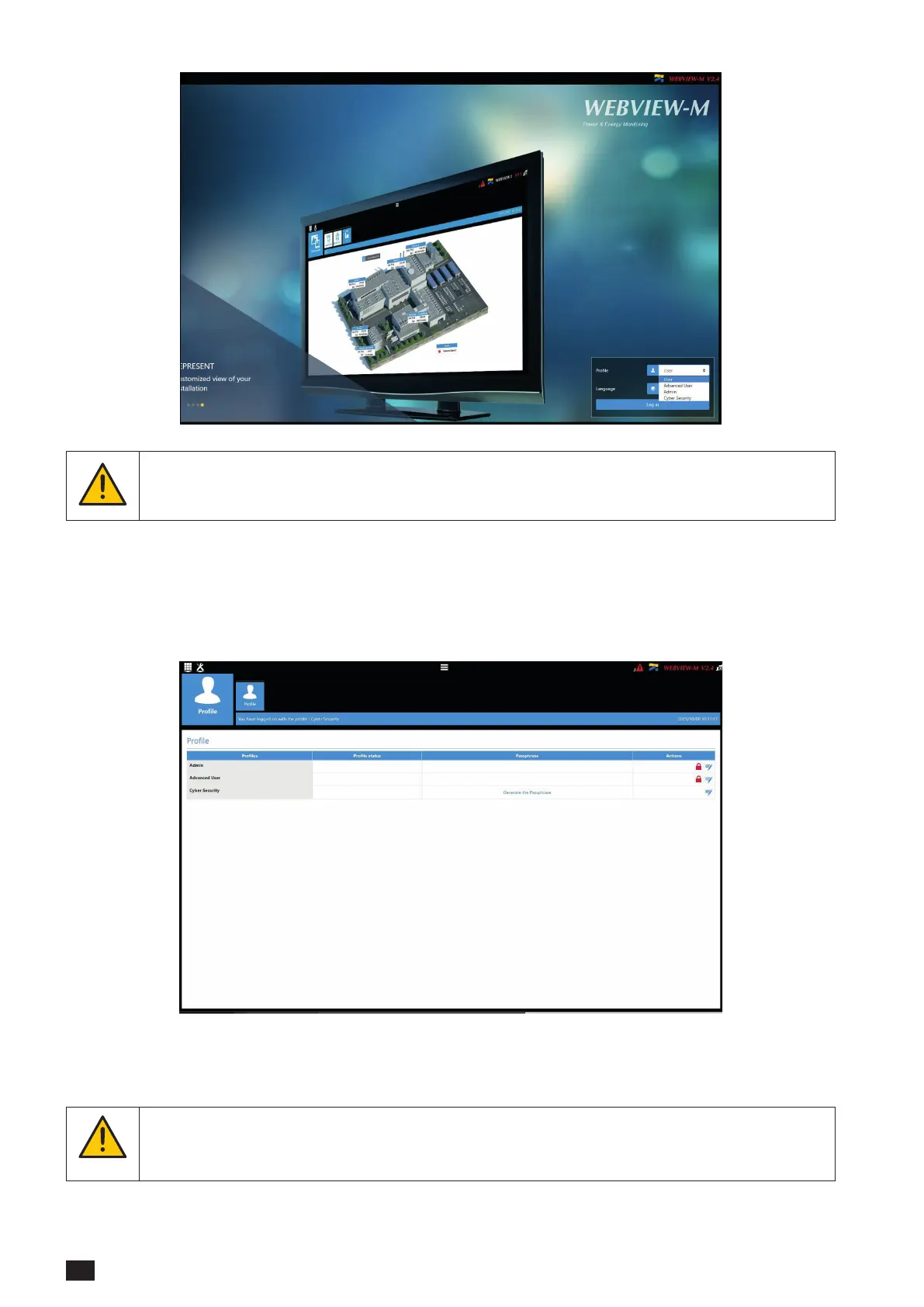 When connecting to the Admin, Advanced User or Cyber security proles for the rst time, it is mandatory