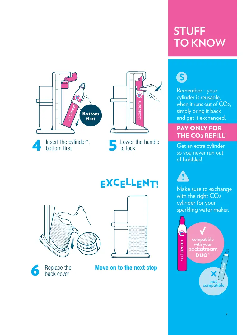 SodaStream DUO - CO₂ Cylinder Usage and Exchange; Step 4: Insert Cylinder Bottom First; Step 5: Lower Handle to Lock; Step 6: Replace Back Cover