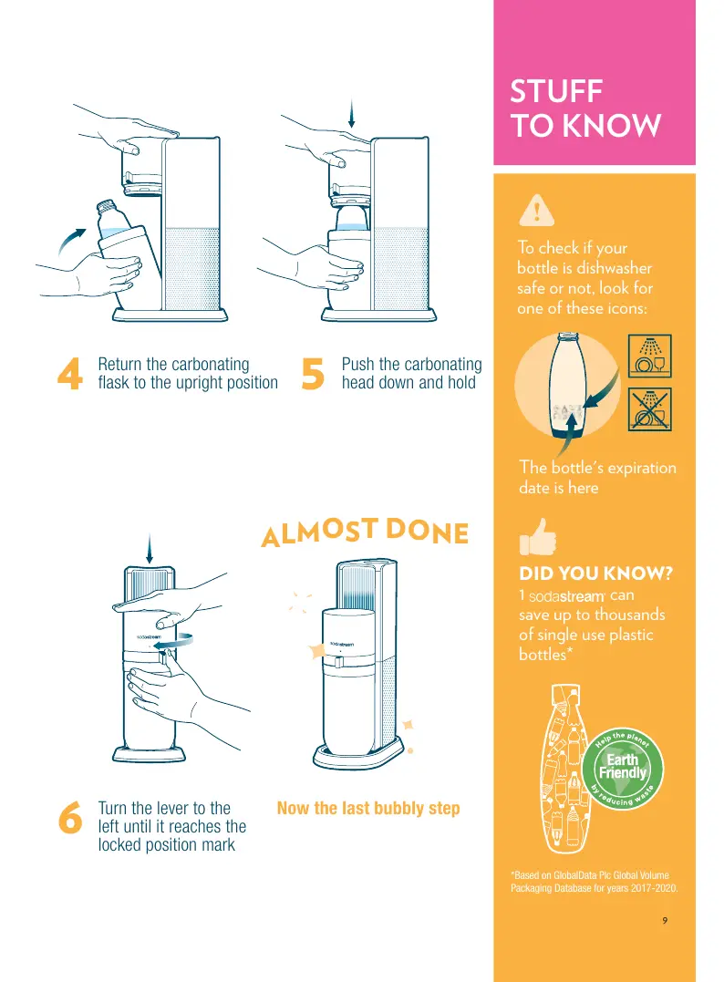SodaStream DUO - Bottle Usage and Safety; Step 4: Return Flask to Upright; Step 5: Push Carbonating Head Down; Step 6: Turn Lever to Lock Position