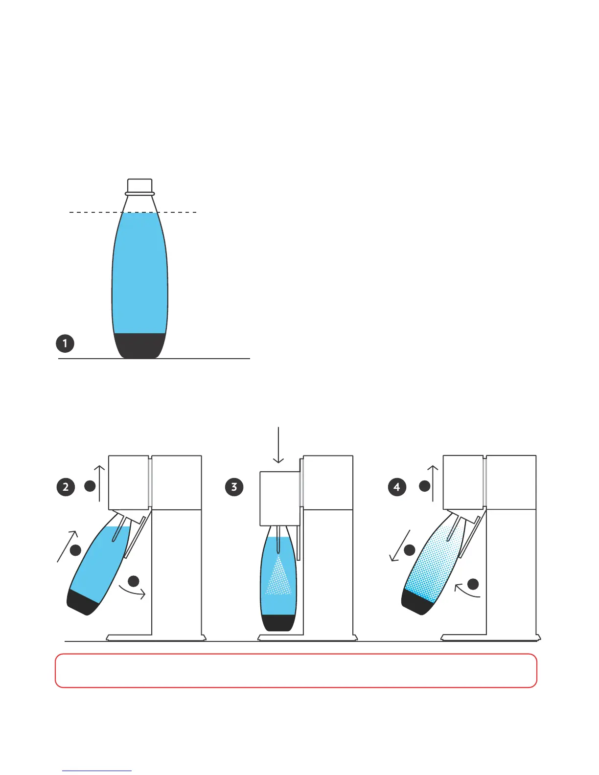 Der må IKKE KARBONERES hvis flasken hviler på basen ellers vil der sprøjtes vand ud.