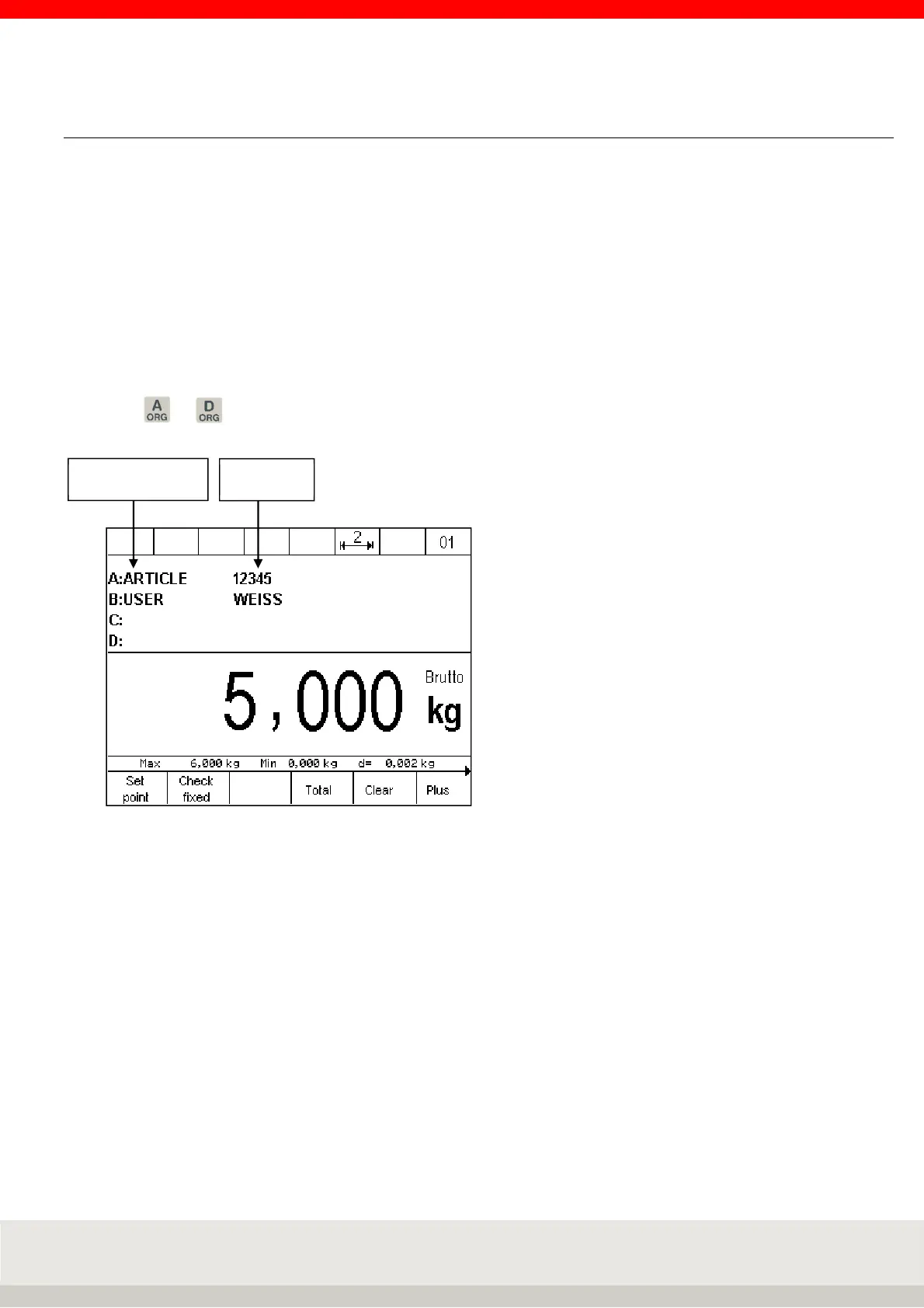The name is entered in the setting mode, the content in the respective weighing mode. The name and