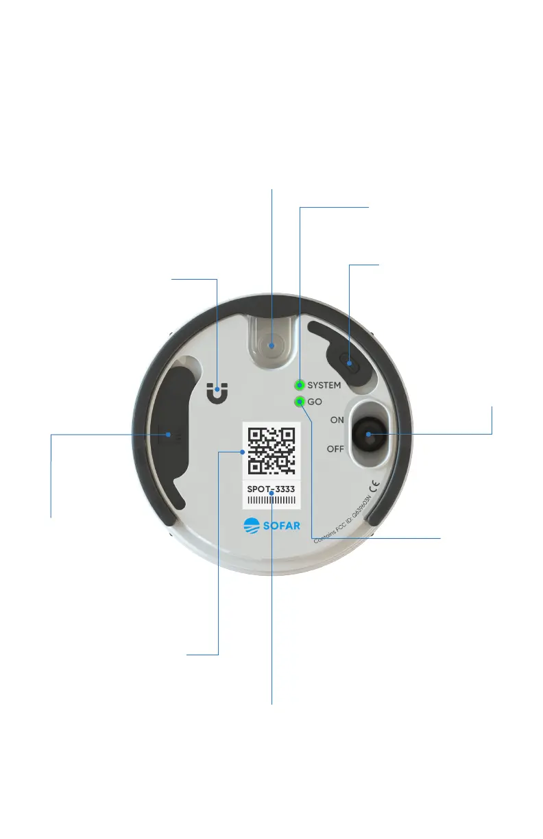 Sofar SPOTTER - User Interface; Mode Switching Magnet; System & Go LEDs; USB-C Port