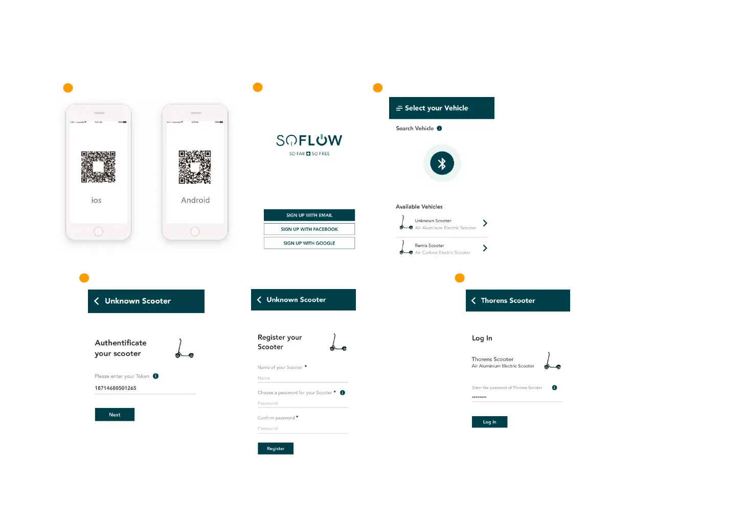 Installieren Sie die App Melden Sie sich an Schalten Sie Ihren Scooter ein und verbinden Sie via Bluetooth
