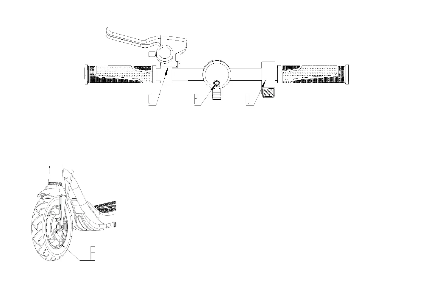 2. Na konzoli C naći ćete zvono i ručicu kočnice. E vam pokazuje kako da uključite SO2 AIR 3. D je ručica gasa kojom možete promeniti brzinu vašeg SO2 Air-a.