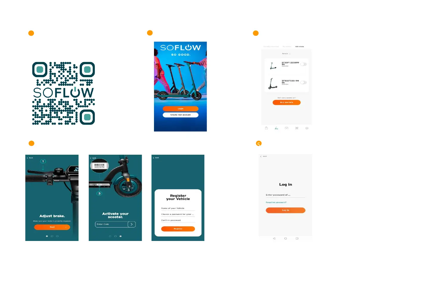 Scan the QR code & Install the app Register / log In Power on your scooter & connect via Bluetooth “Add vehicle”