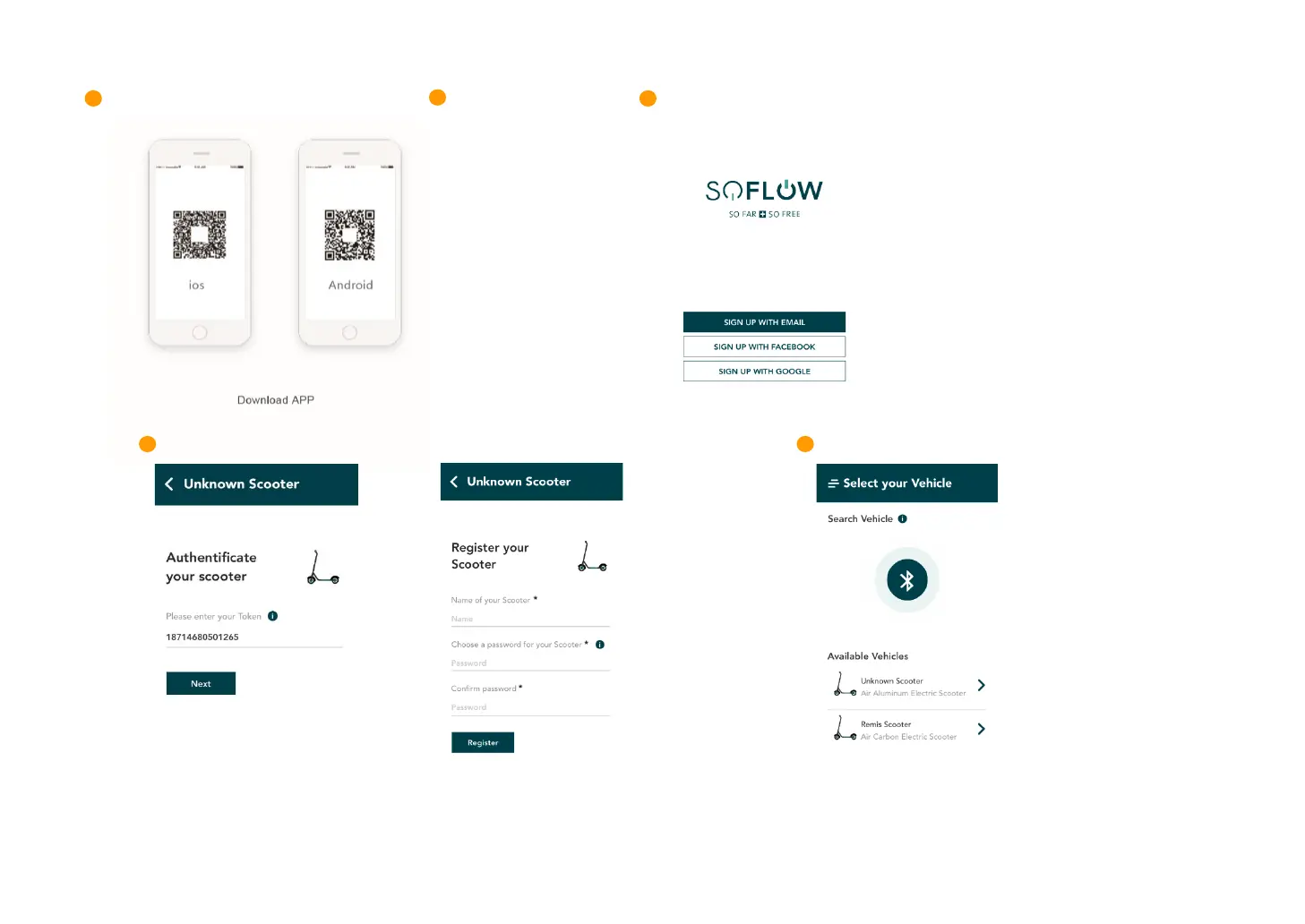 Installer appen Registrer deg / logg inn Slå på sparkesykkelen og koble til via Bluetooth