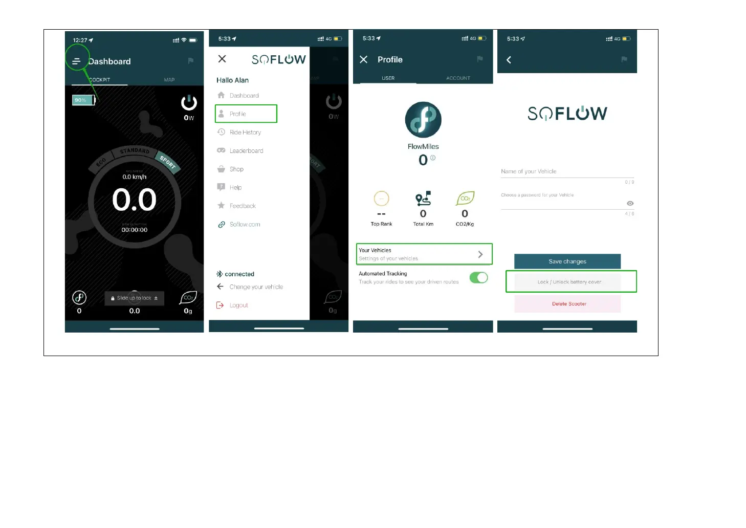 Abra el panel. Ir al perfil. Abra su vehículo y verá el botón de bloqueo / desbloqueo de la tapa de la batería. Para más detalles ver las fotos