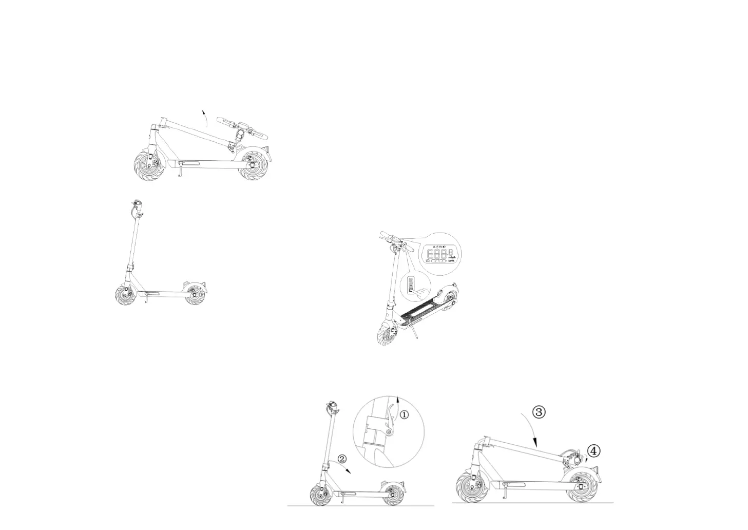 Før du legger sammen SO4 2ND GEN / SO4 PRO / SO4 PRO 2ND GEN, må du kontrollere at sparkesykkelen er slått av. Trykk på bøylen som vist på illustrasjonen, og trekk ned spaken.