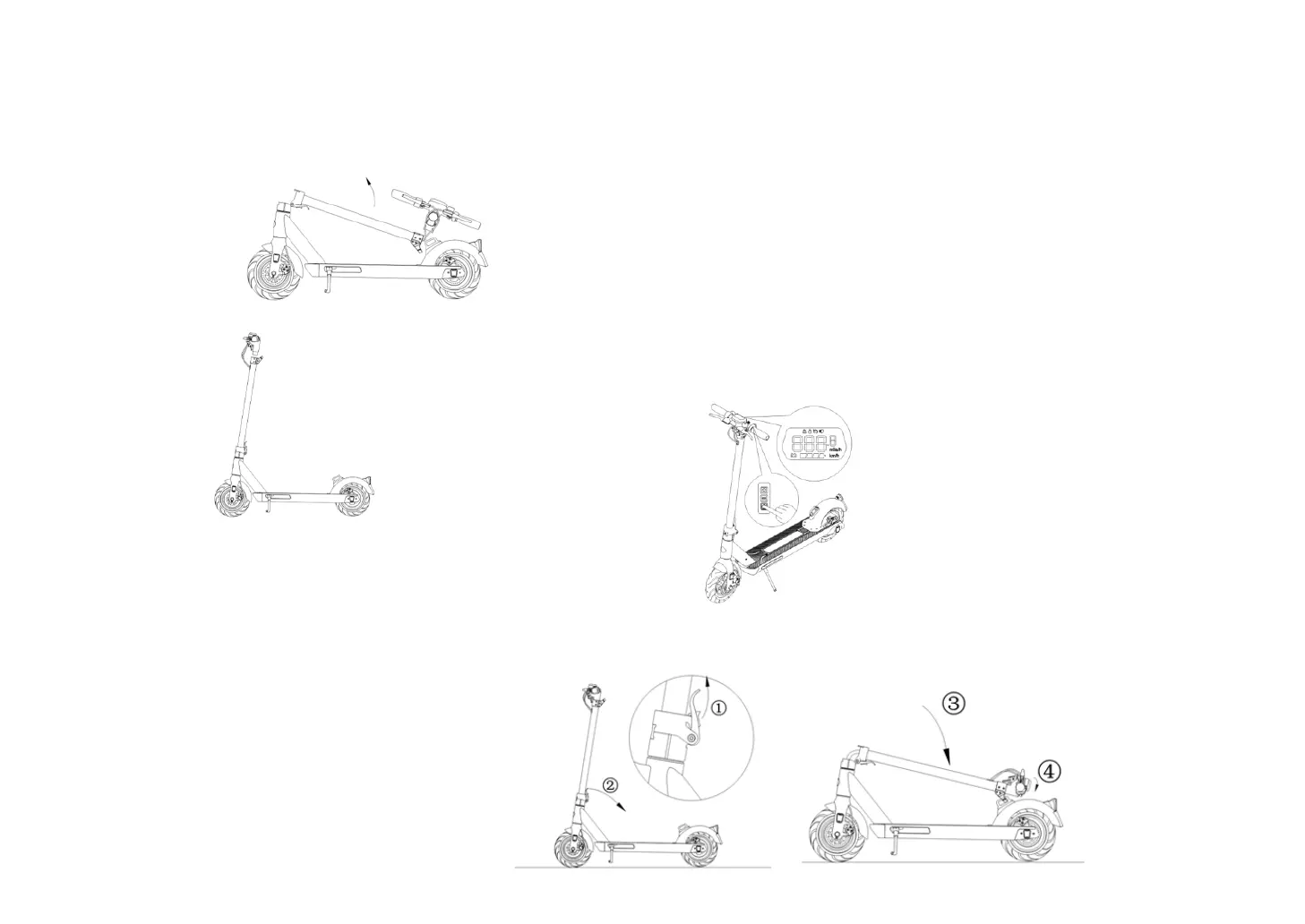 Prima di chiudere l'SO4/SO4 PRO, assicuratevi che il monopattino sia spento. Premete la fibbia come mostrato in figura e abbassate la leva. Piegate e abbassate il piantone anteriore sul